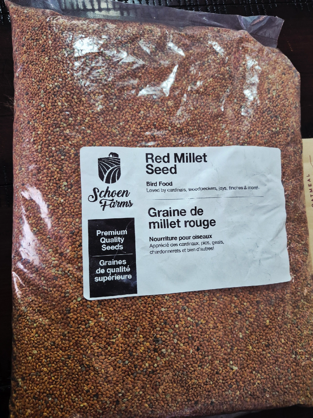 Selling a bag of Schoen Farms Red Millet Seed, perfect for feeding cardinals, woodpeckers, jays, finches, and more! It's premium quality seed to keep your feathered friends happy and well-fed