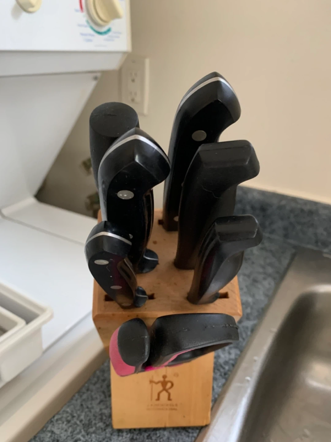 Selling a J.A. Henckels knife set. It includes a variety of knives in a wooden block. Great for any kitchen! Comes with a paring, sharpener,bread and slicing Porch Pick up Moving Sale
