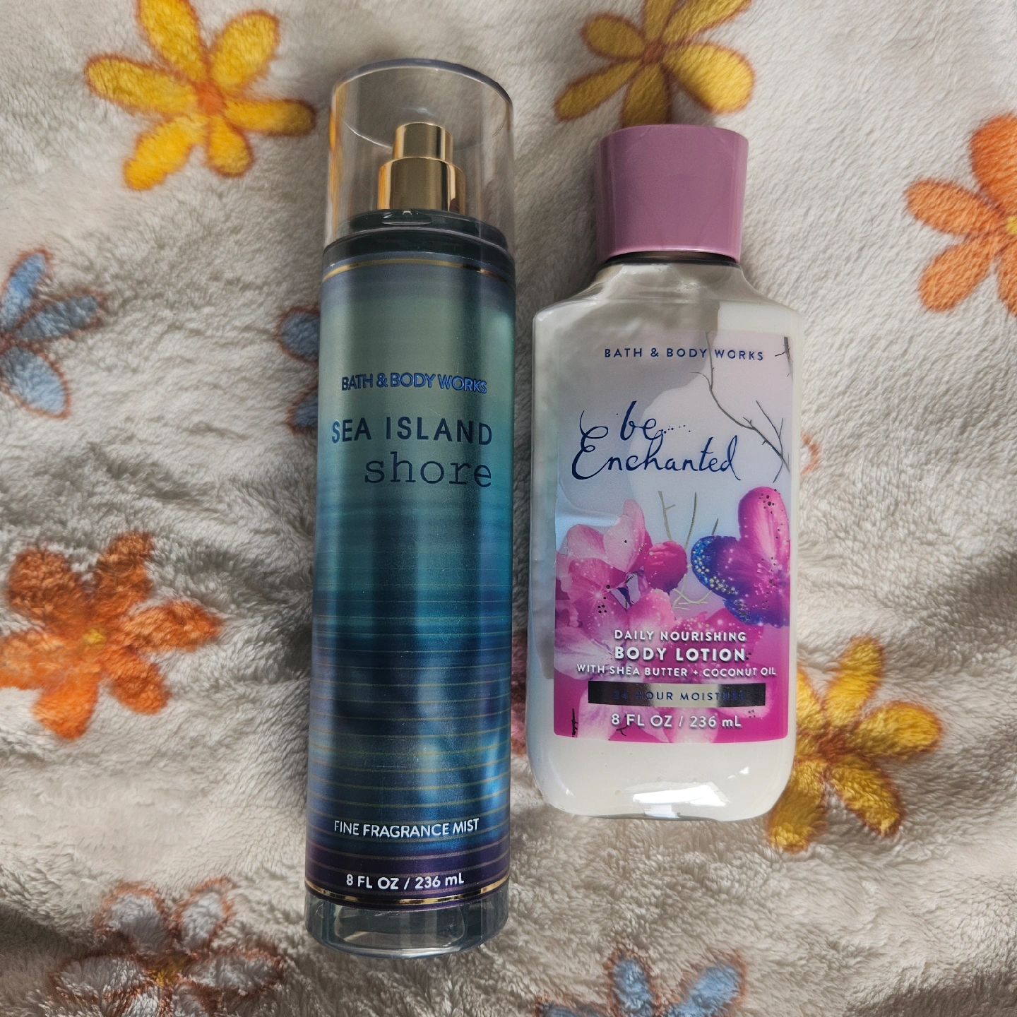 Selling a Bath & Body Works set! You'll get both the Sea Island Shore fine fragrance mist and the Be Enchanted daily nourishing body lotion. Both bottles are 8 fl oz / 236 mL
