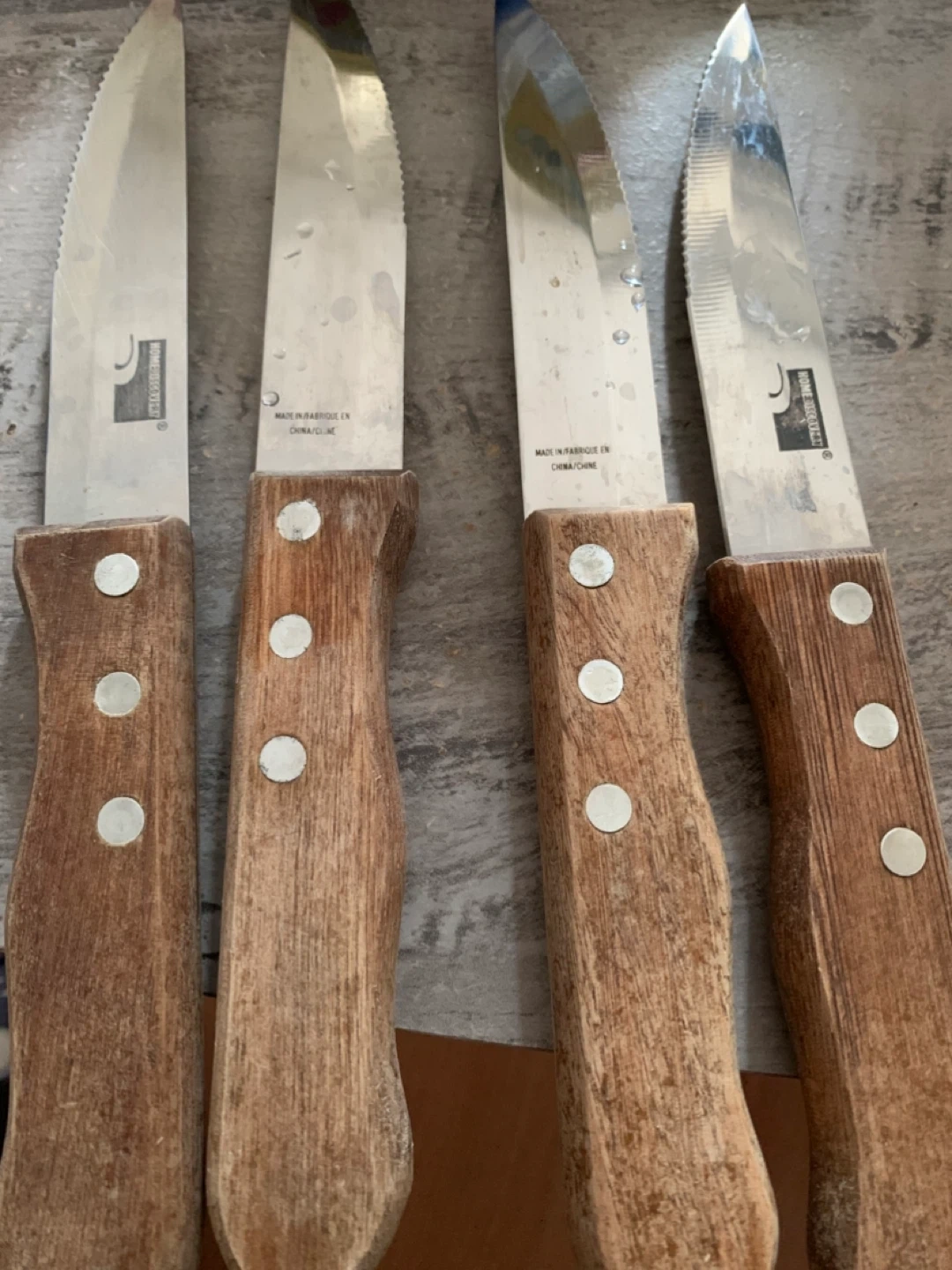 Selling a set of four steak knives. The knives are marked 'Home 3030' and 'Made in China'. They have a wooden handle with three rivets.