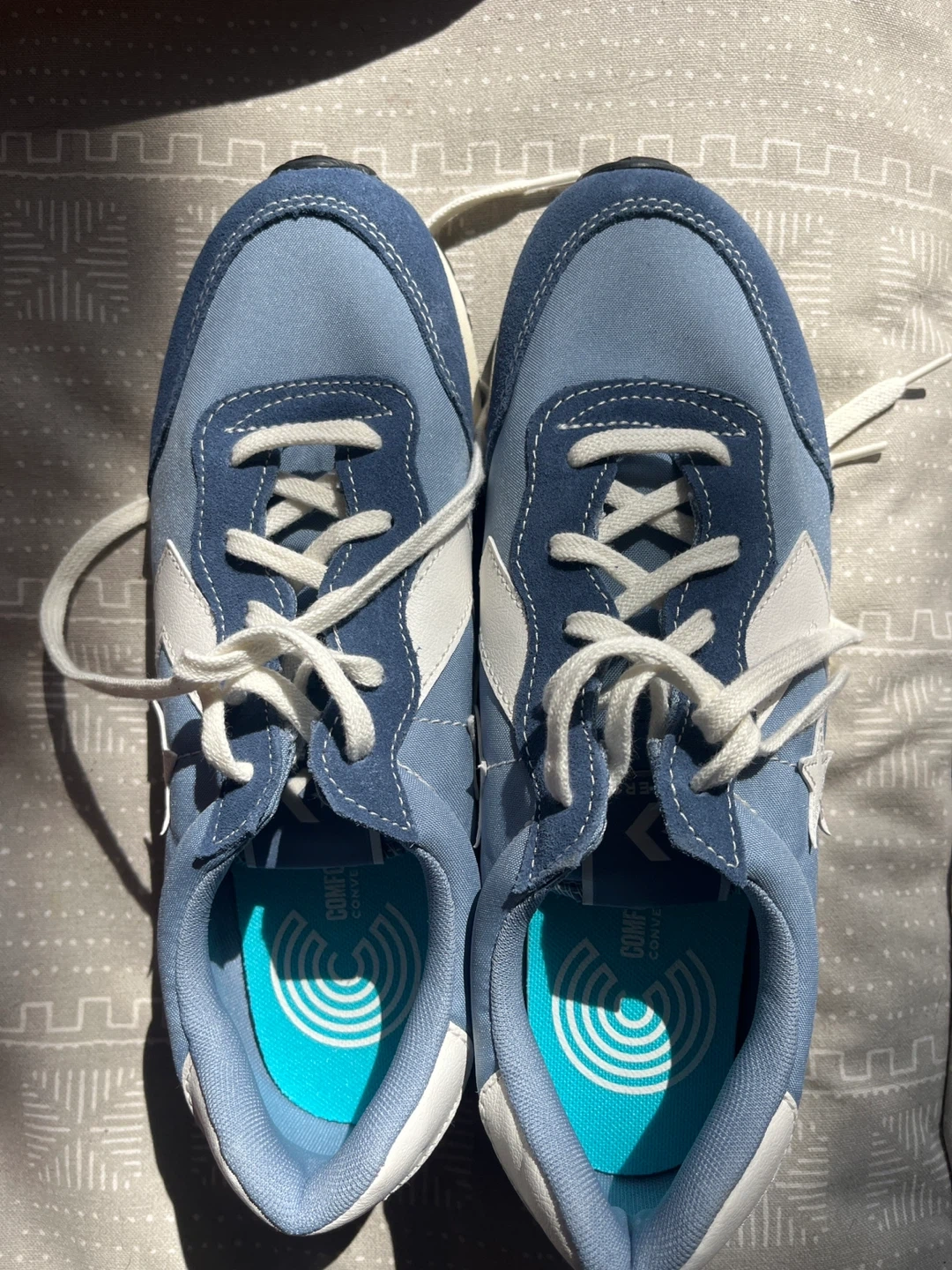Brand New Converse Omega sky blue trainers. Comfy Curve insole for extra support. Trendy updated retro style. The light blue colour is perfect for Percy Jackson fans. Check out the photos for the sole and the iconic star logo. Newest style currently in stores. They’ve never been worn. (My kid outgrew size while away and I missed the return date by a day).