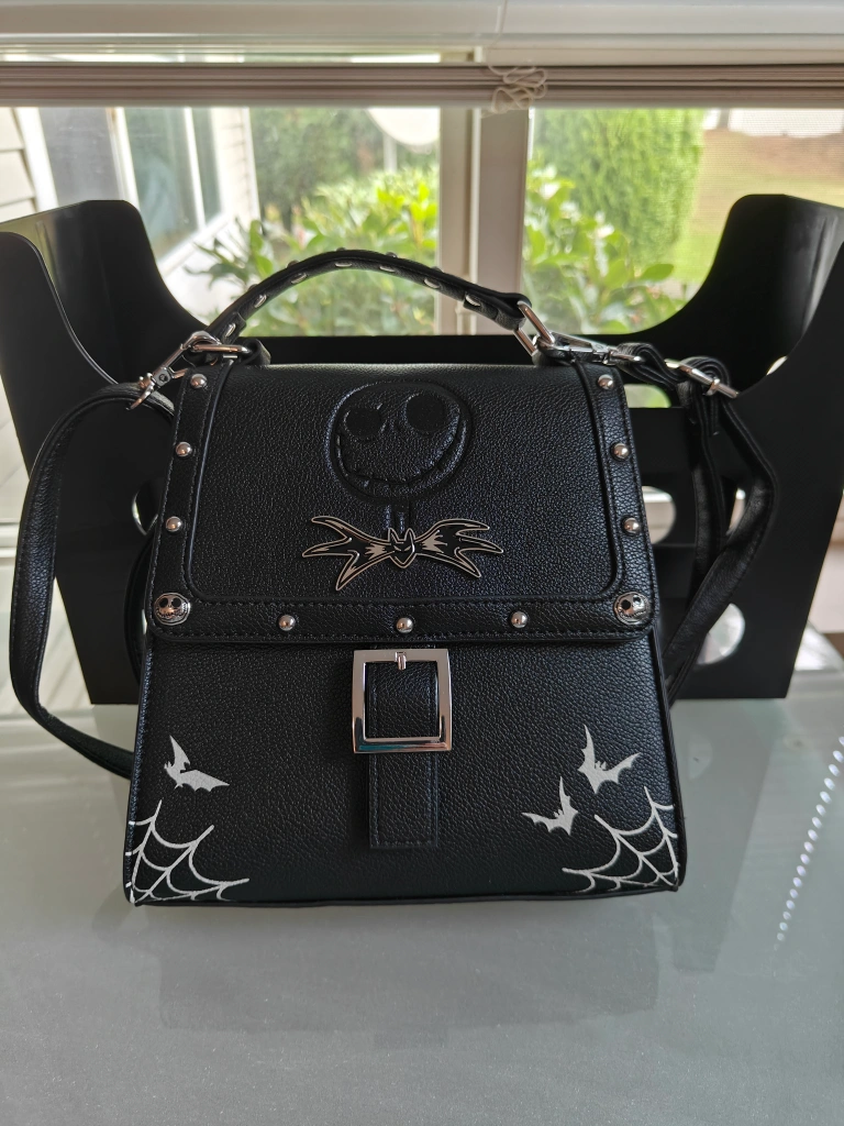 Super cute Nightmare Before Christmas crossbody bag! It's black with Jack Skellington and bat designs. Perfect for any Tim Burton fan.