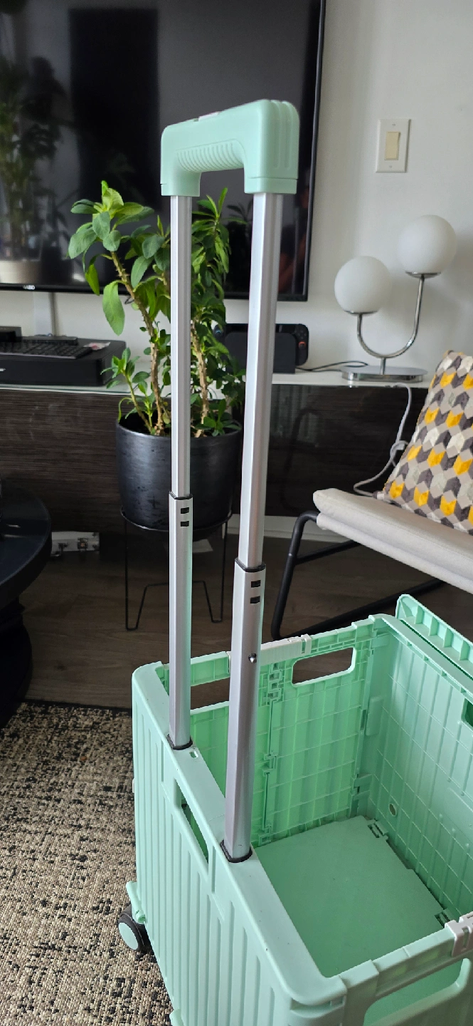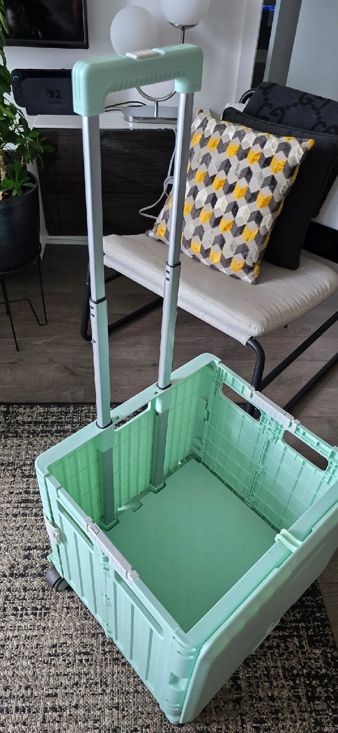 1000+PICK UP DUNDAS AND REGENT PARK This collapsible rolling storage crate is perfect for organizing your space! It's a lovely mint green colour and has a handle for easy transport. Great for groceries, laundry, or storing items in your car or home
