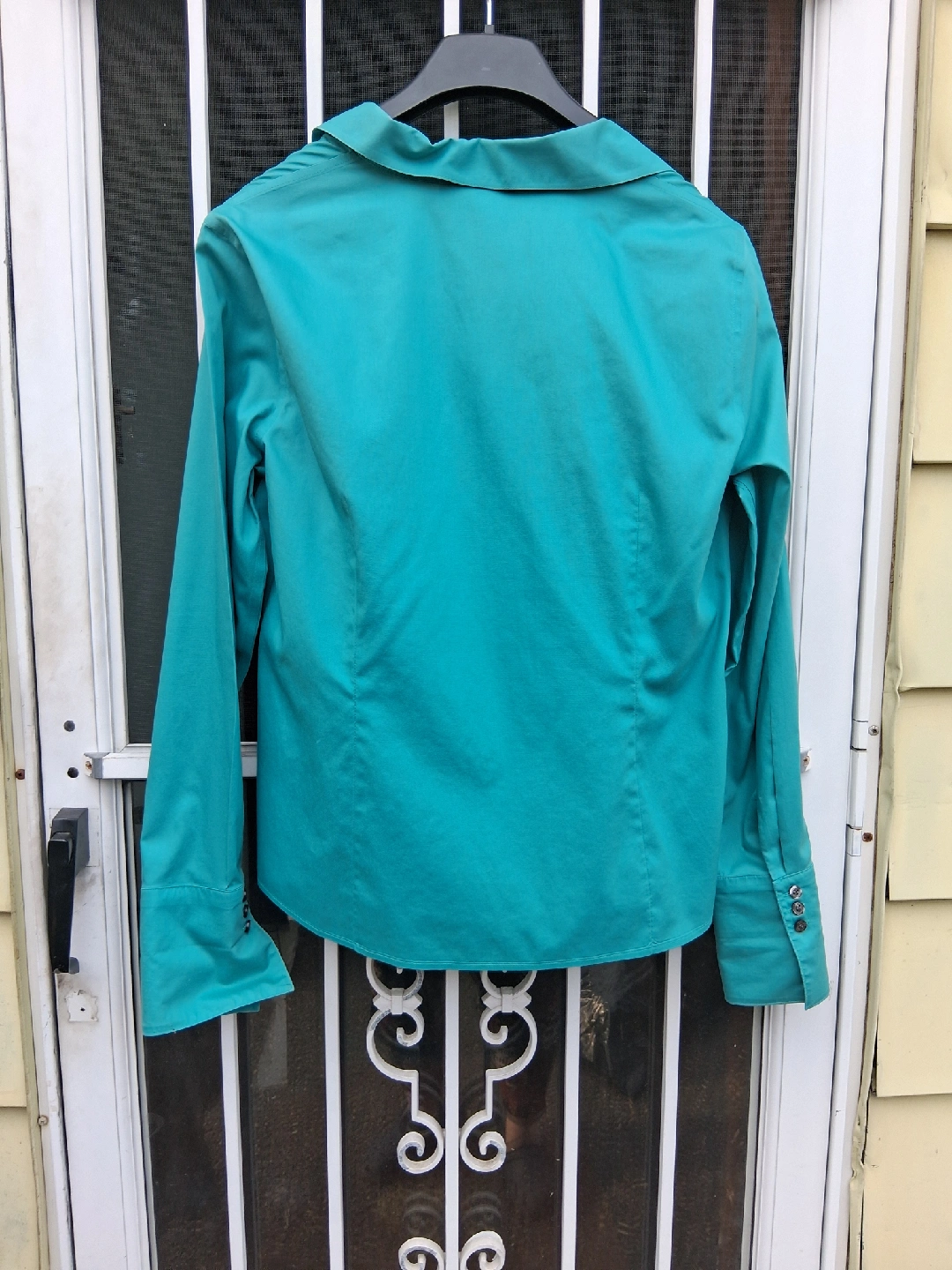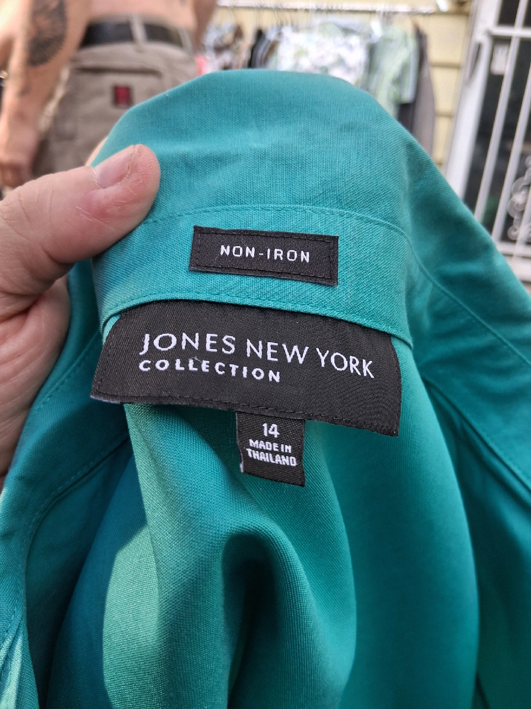 Here's a Jones New York Collection button-down shirt in a vibrant turquoise color! It's a size 14 and made from 100% cotton. The shirt is also labeled as non-iron, making it super easy to care for. Machine wash cold, gentle cycle; tumble dry low heat; press with cool iron if necessary. Brand new never worn. No tag. Located in Fair Lawn NJ, CASH ONLY!!! All sales are final once purchased π Thank you!