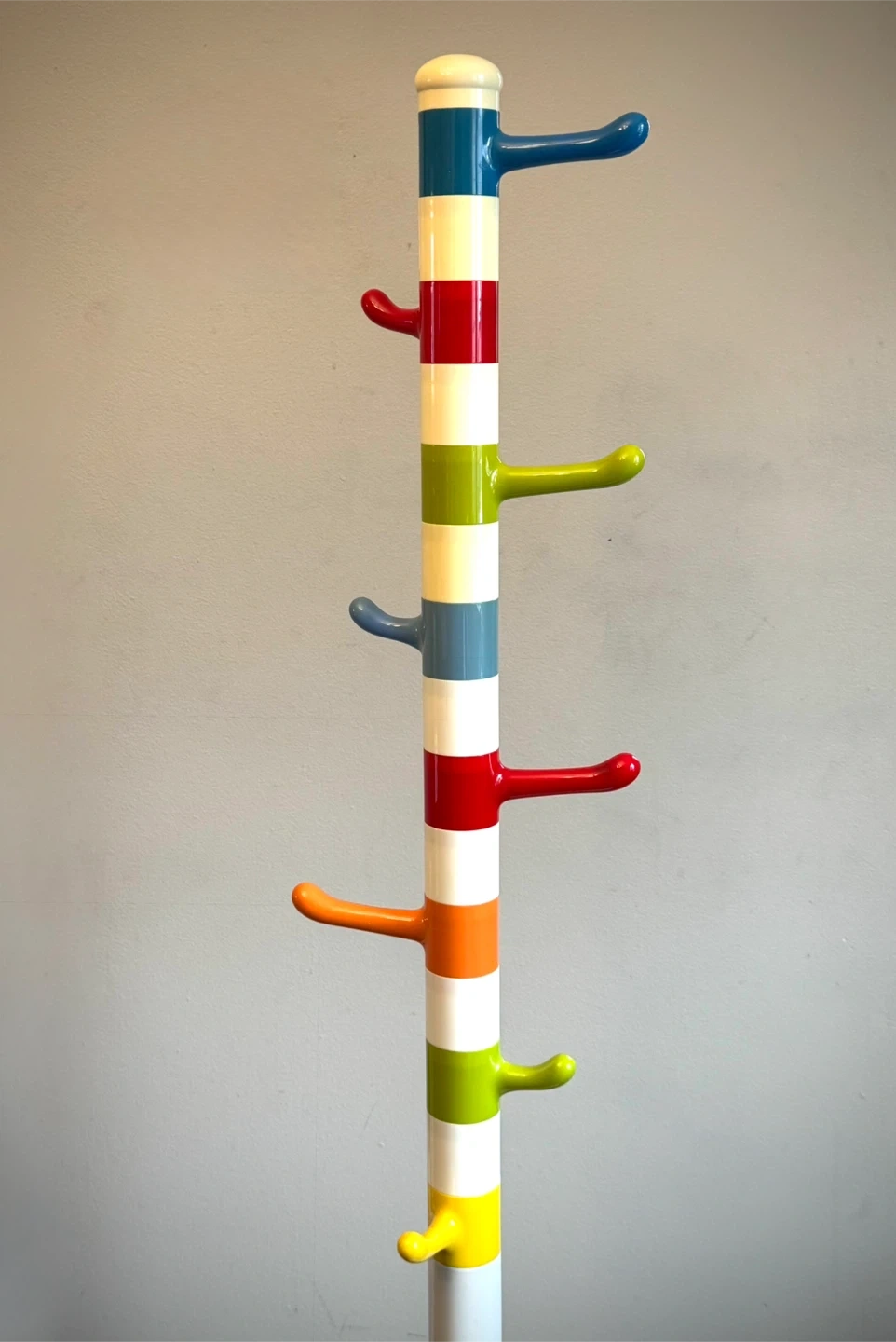 Lovely multicolour posts/hooks for hanging jackets. Very sturdy and in great condition. Some small scuffs around the solid heavy base but otherwise perfect.