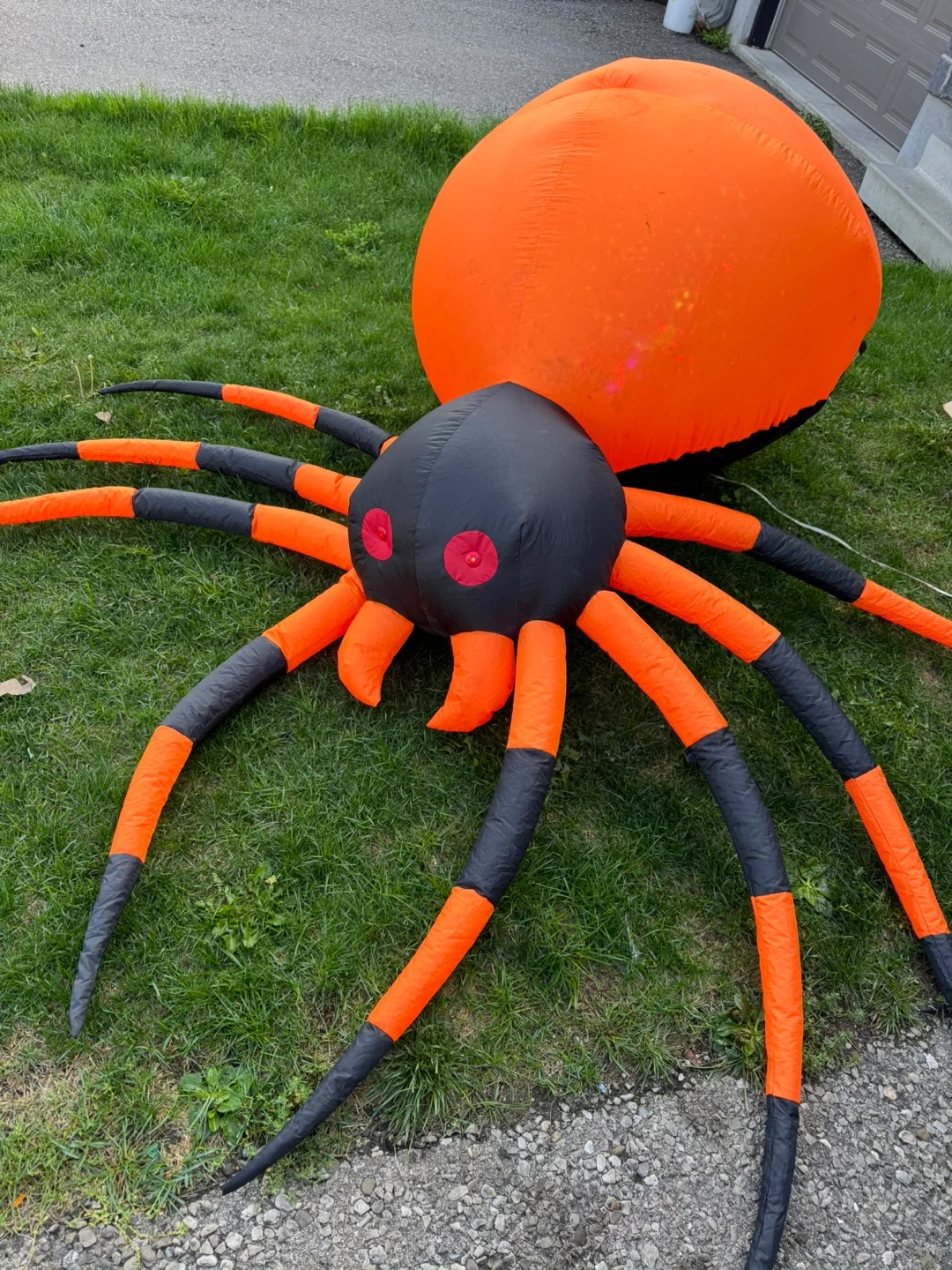 Get ready for Halloween with this fun inflatable spider decoration! It's perfect for adding a spooky touch to your yard. The spider is orange and black, and it's sure to be a hit with trick-or-treaters