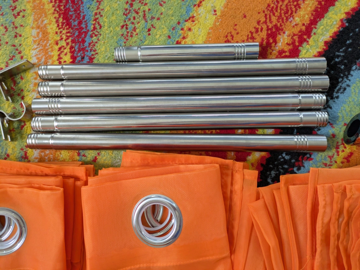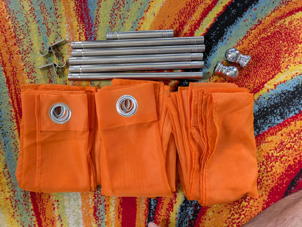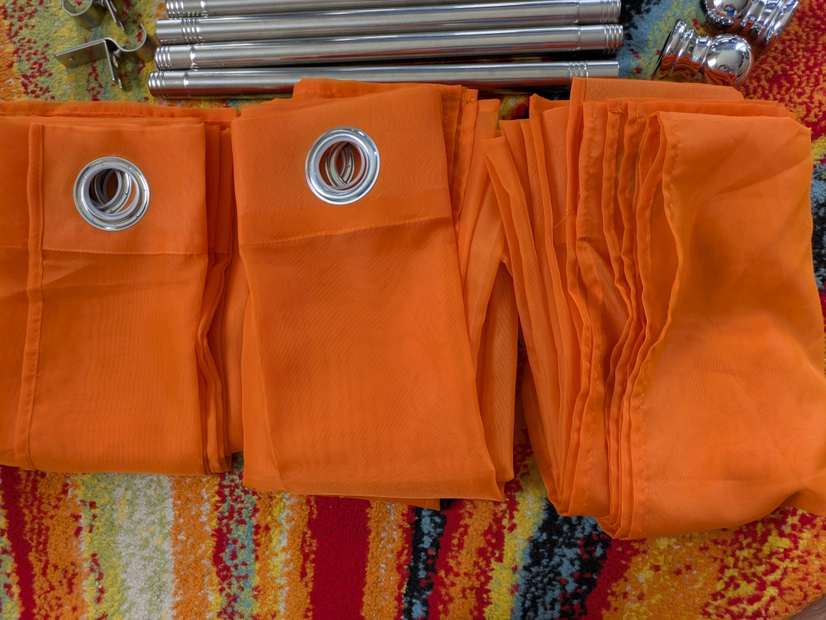 Here's a set of sheer curtains in a vibrant orange colour! They come with a adjustable rod and all the necessary hardware for installation. These curtains are perfect for adding a pop of colour and a touch of elegance to any room. They're in great condition and ready to brighten up your space.