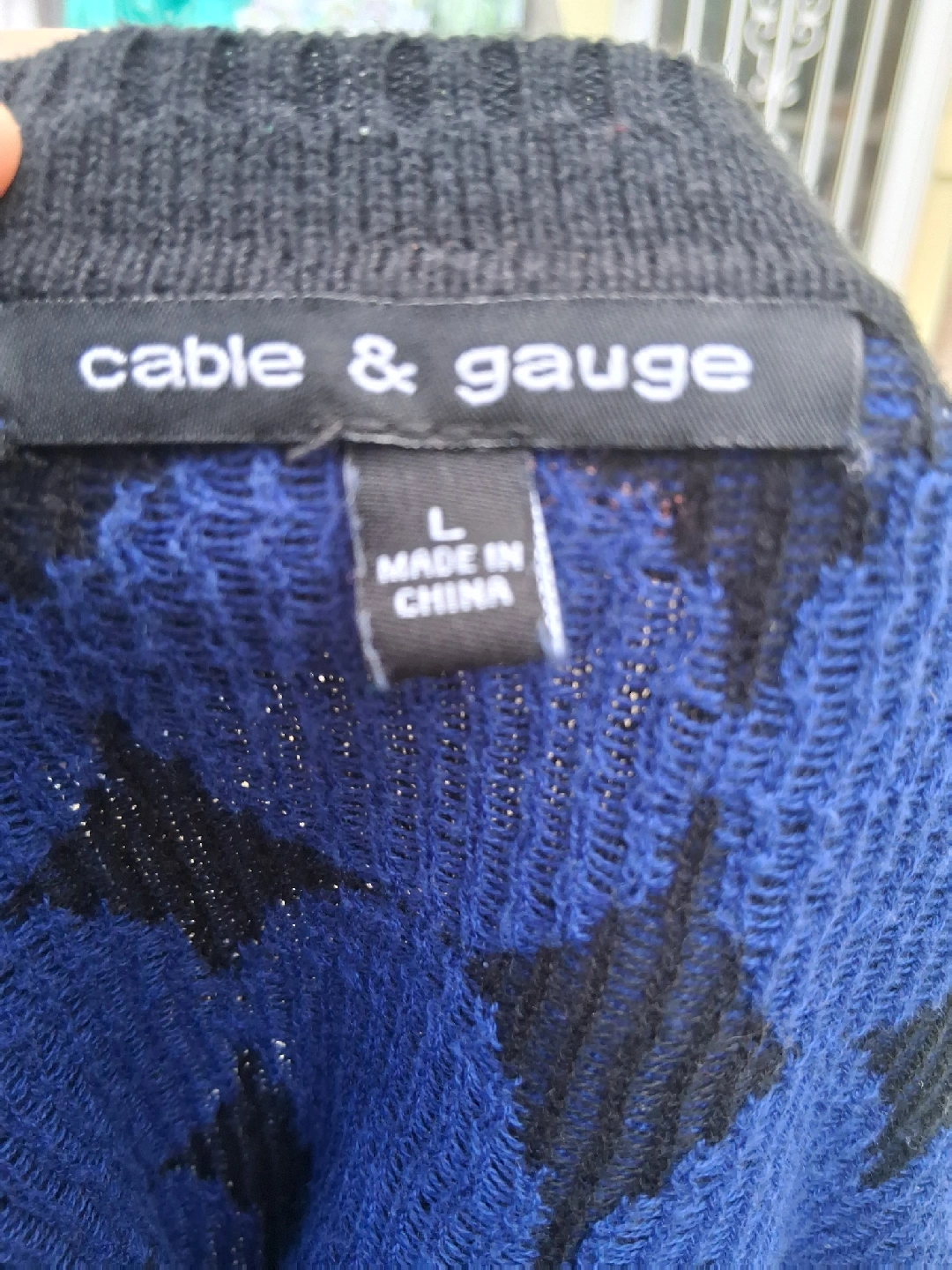 Selling a Cable & Gauge sweater in size large. It features a stylish blue and black pattern. The material is a blend of 60% cotton and 40% acrylic, making it comfortable and easy to care for. Machine washable on a cold, gentle cycle