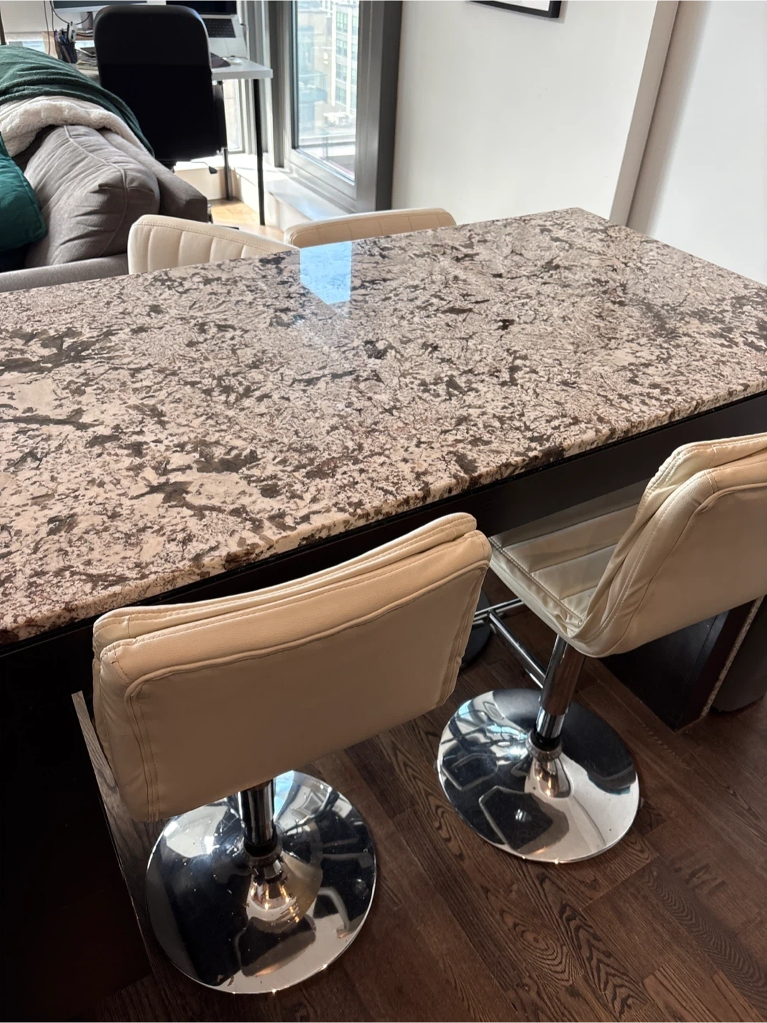 Selling two adjustable height bar stools. They’d look fantastic in any kitchen or bar area. The seats are a nice neutral colour, and the chrome base is shiny and modern. Great for adding extra seating!