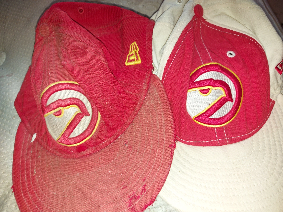 Two Atlanta Hawks hats for sale! One is red and the other is off-white. Both are New Era brand and from the Hardwood Classics line. They show some signs of wear, as you can see in the photos.
