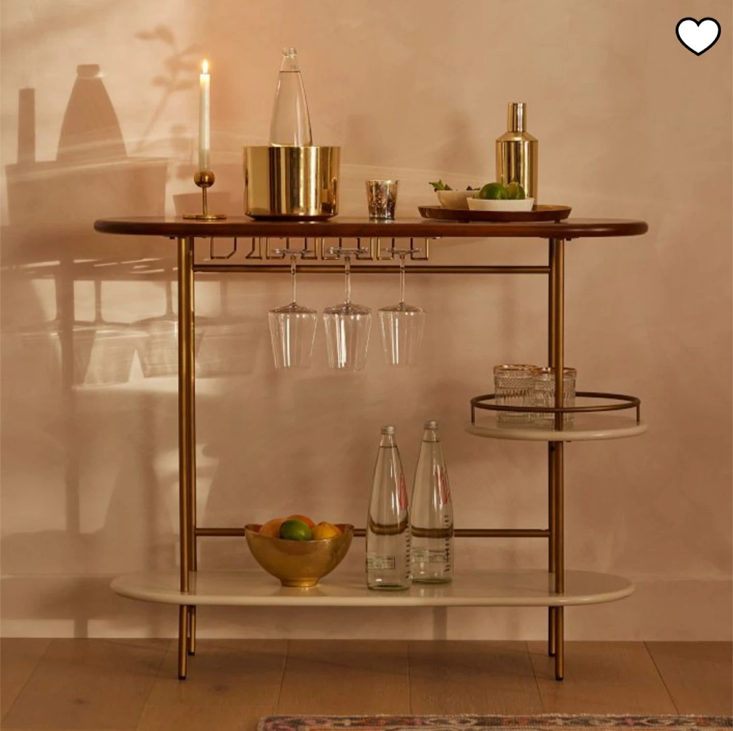 Selling a Williams Sonoma tiered bar console! It features a wood top, gold-tone frame, and a white lower shelf. The dimensions are 1067 x 356 x 864mm. Perfect for entertaining or adding a touch of elegance to your space. Here is the listing on west elm for more details: https://www.westelm.ca/products/tiered-bar-console-h2419/?catalogId=71&sku=5610329&cm_ven=PLA&cm_cat=Google&cm_pla=Furniture%20%3E%20Bar%20%26%20Kitchen%20Furniture&cm_ite=5610329_13539753036&gad_source=1&gad_campaignid=13539753036&gbraid=0AAAAAC06p2CCgMwmE26cy9SFgfoPJcsmw&gclid=EAIaIQobChMI1azLxLf5jwMVZTcIBR14QhomEAQYAiABEgK0O_D_BwE