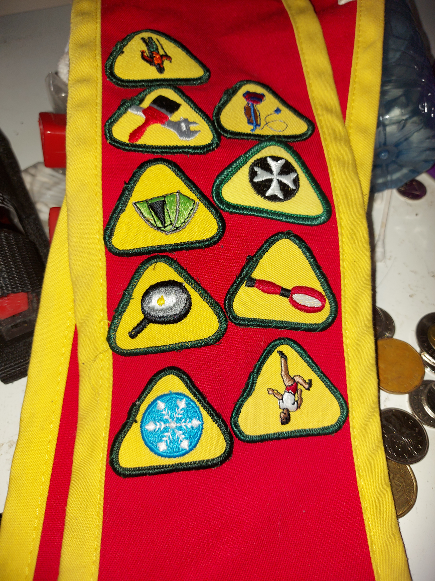 Selling a Scouts Canada neckerchief! It's red with yellow trim and has a bunch of cool badges sewn on. Perfect for any scout looking to show off their achievements or for someone who appreciates vintage scouting memorabilia