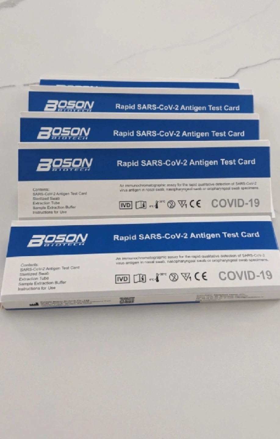 Selling a few boxes of Boson Biotech Rapid SARS-CoV-2 Antigen Test Cards. Each box contains the necessary components for testing, including sterilized swabs, extraction tubes, and sample extraction buffer, along with instructions for use. These are handy to have at home!