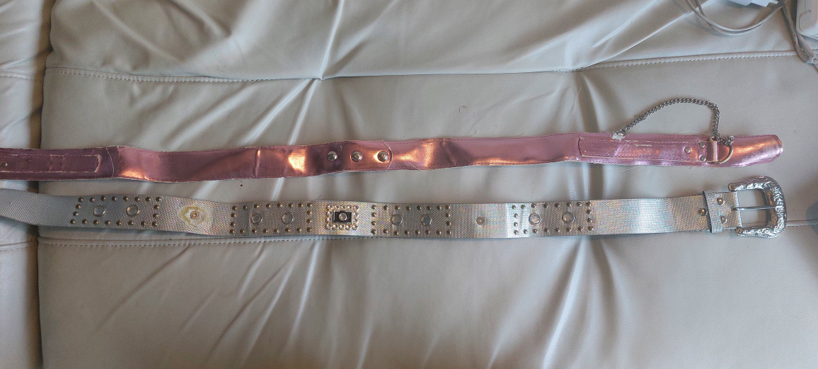 Selling two belts! One is a shiny pink colour, and the other is silver with studs. Both are in good condition, ready to add some flair to your outfits