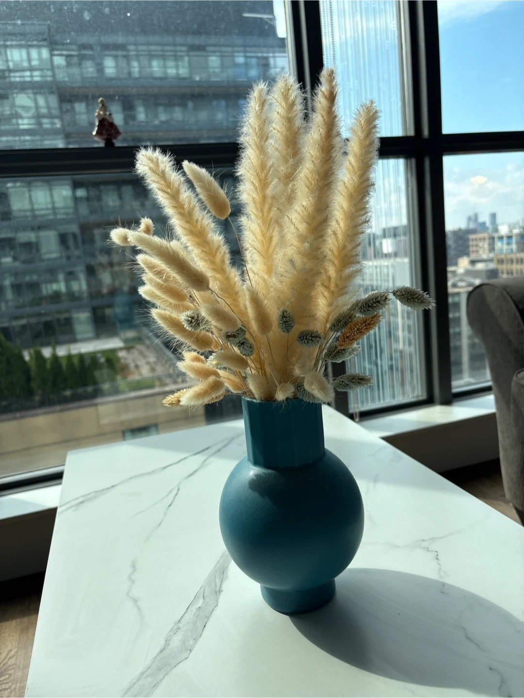 A lovely blue vase with dried flowers, perfect for adding a touch of natural beauty to your home decor. This piece is in great condition and ready to find a new home!