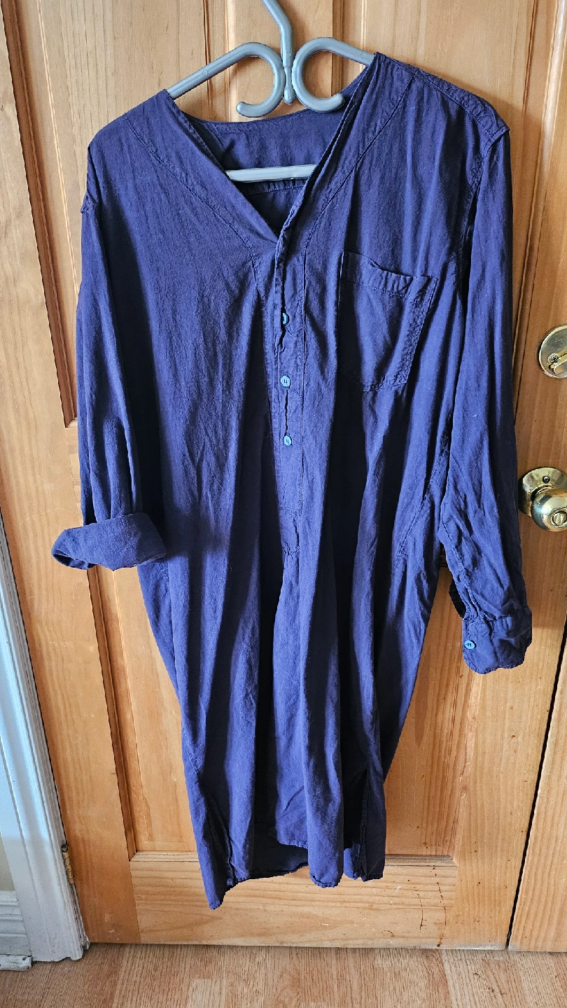 A long-sleeved shirt dress/tunic in a lovely shade of navy blue! It's in great condition and ready for a new home. Perfect for layering or wearing on its own. Available for pick-up near Oakwood Village.