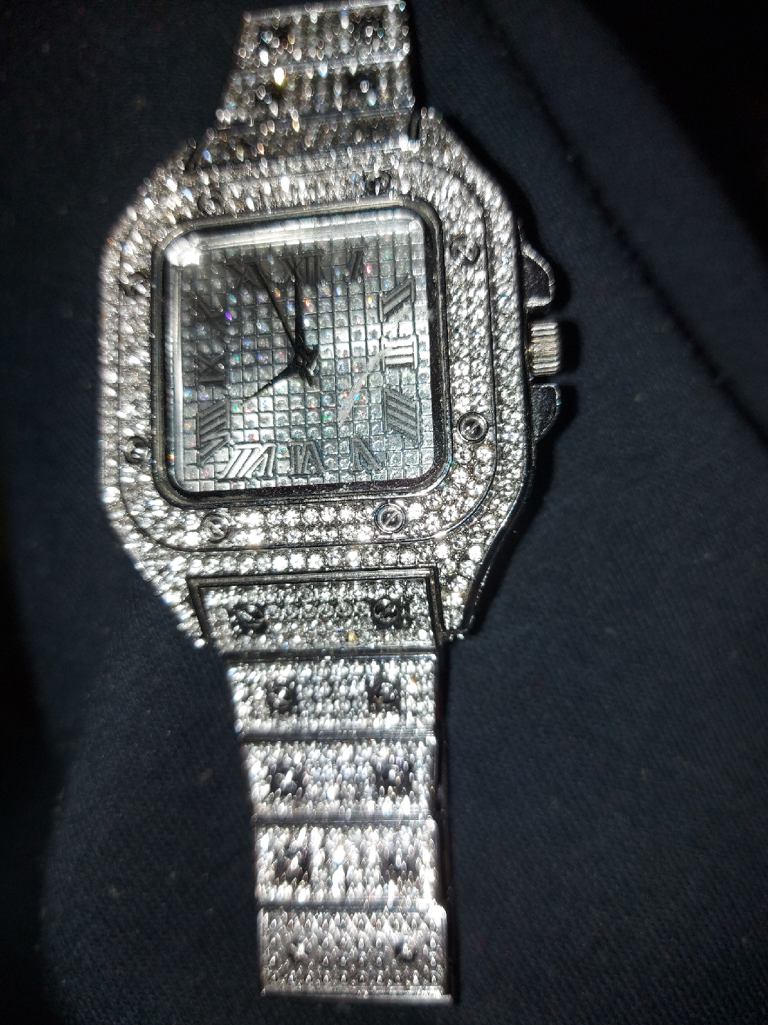 Selling a men's diamond watch. It's a stylish piece that adds a touch of bling to any outfit. The watch features a square face and is covered in sparkling diamonds. It's in great condition and ready to wear!
