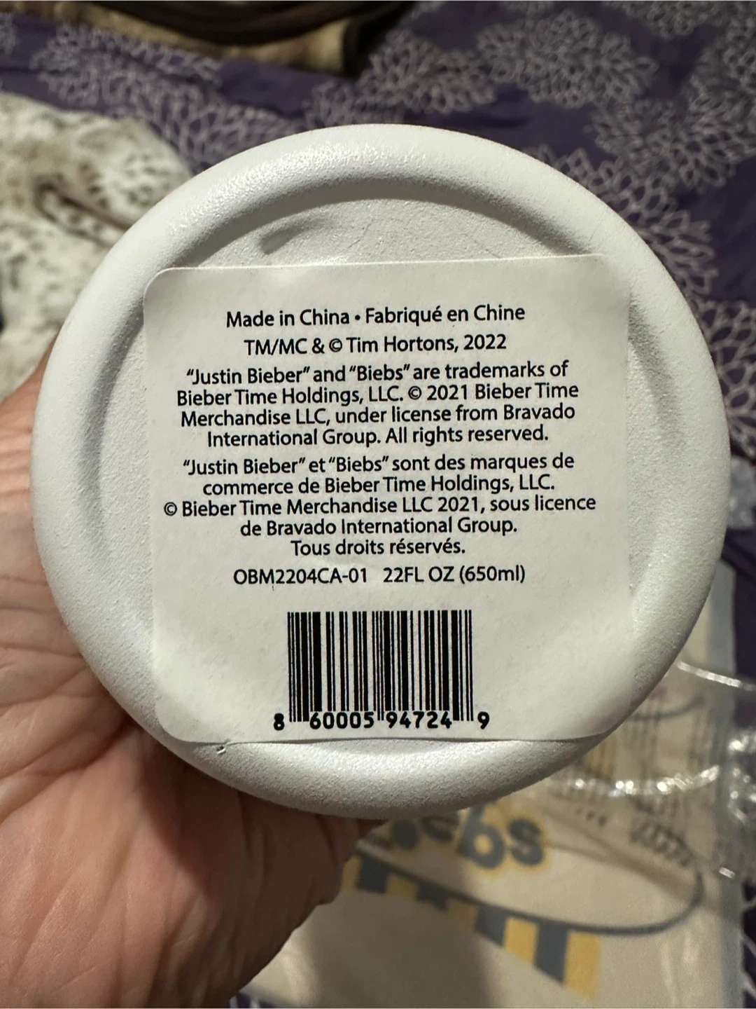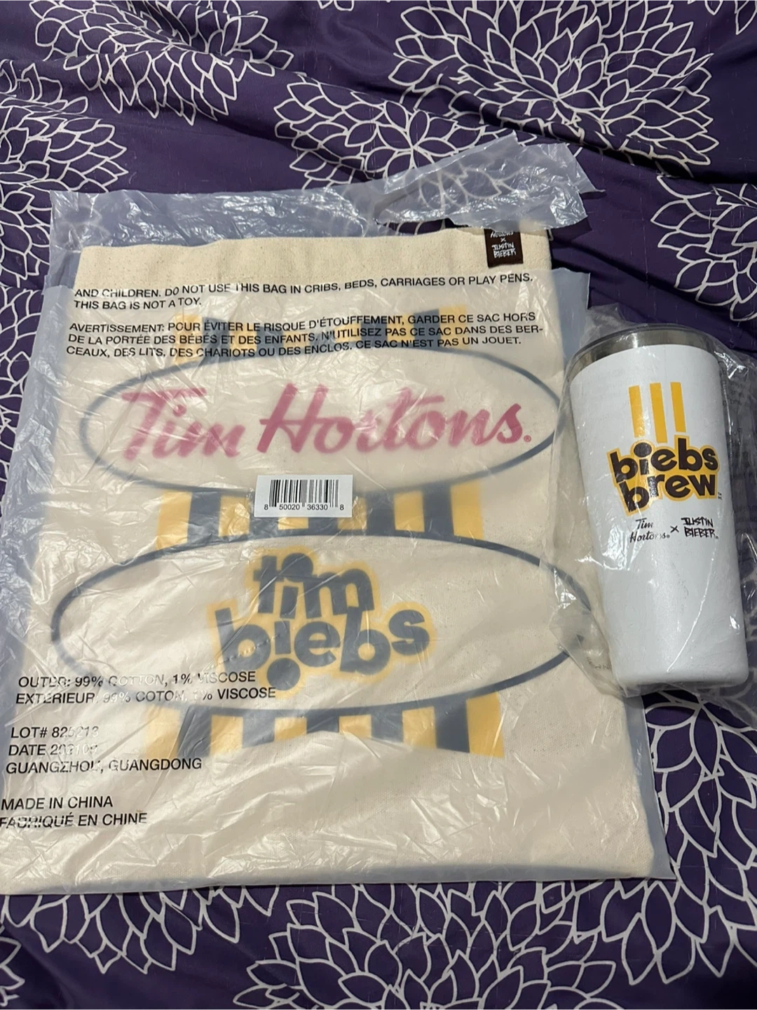 Selling a Tim Hortons x Justin Bieber Biebs Brew tumbler and tote bag! The tumbler is 22 fl oz (650ml). Both items are in excellent condition and ready for a new home, both in original packaging, tote bags package has been opened, both items have not been used, smoke free home.