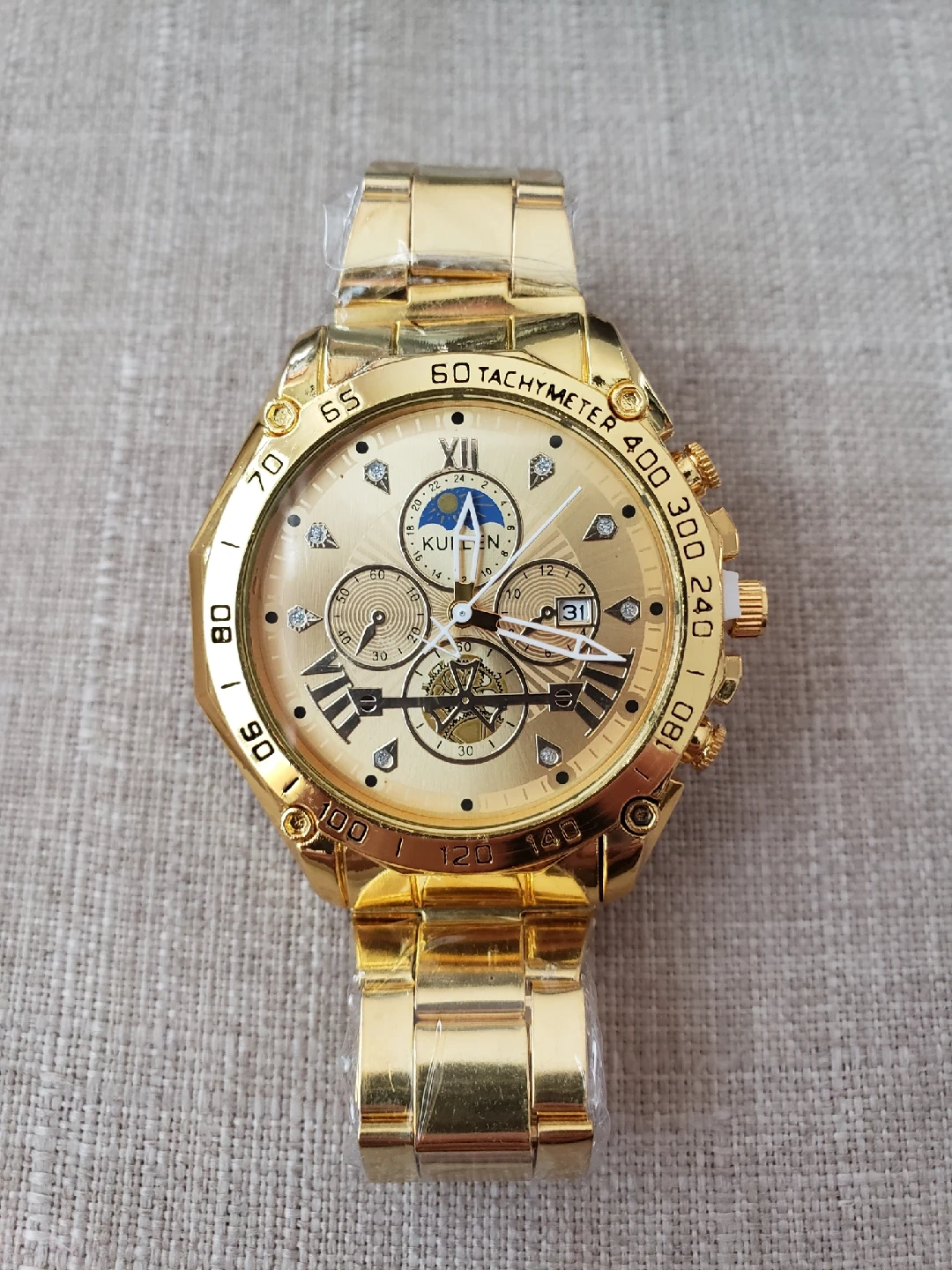 Selling a KUIREN gold watch. It's in great condition and has a tachymeter. The date is displayed on the face. It's a stylish and functional timepiece!