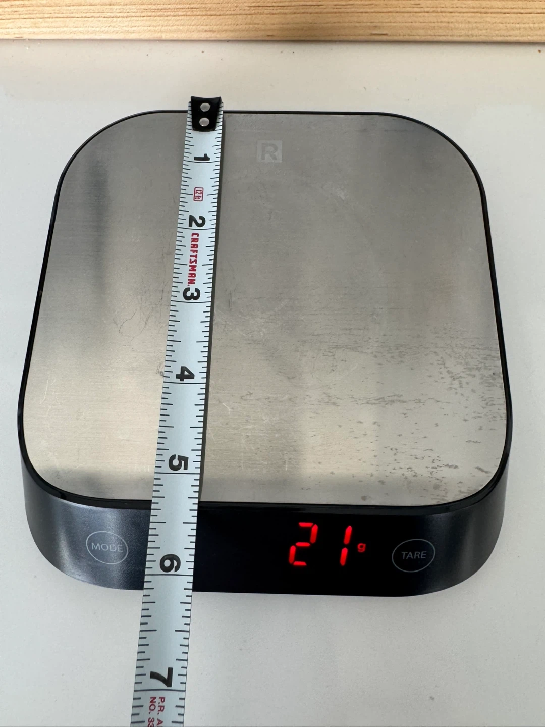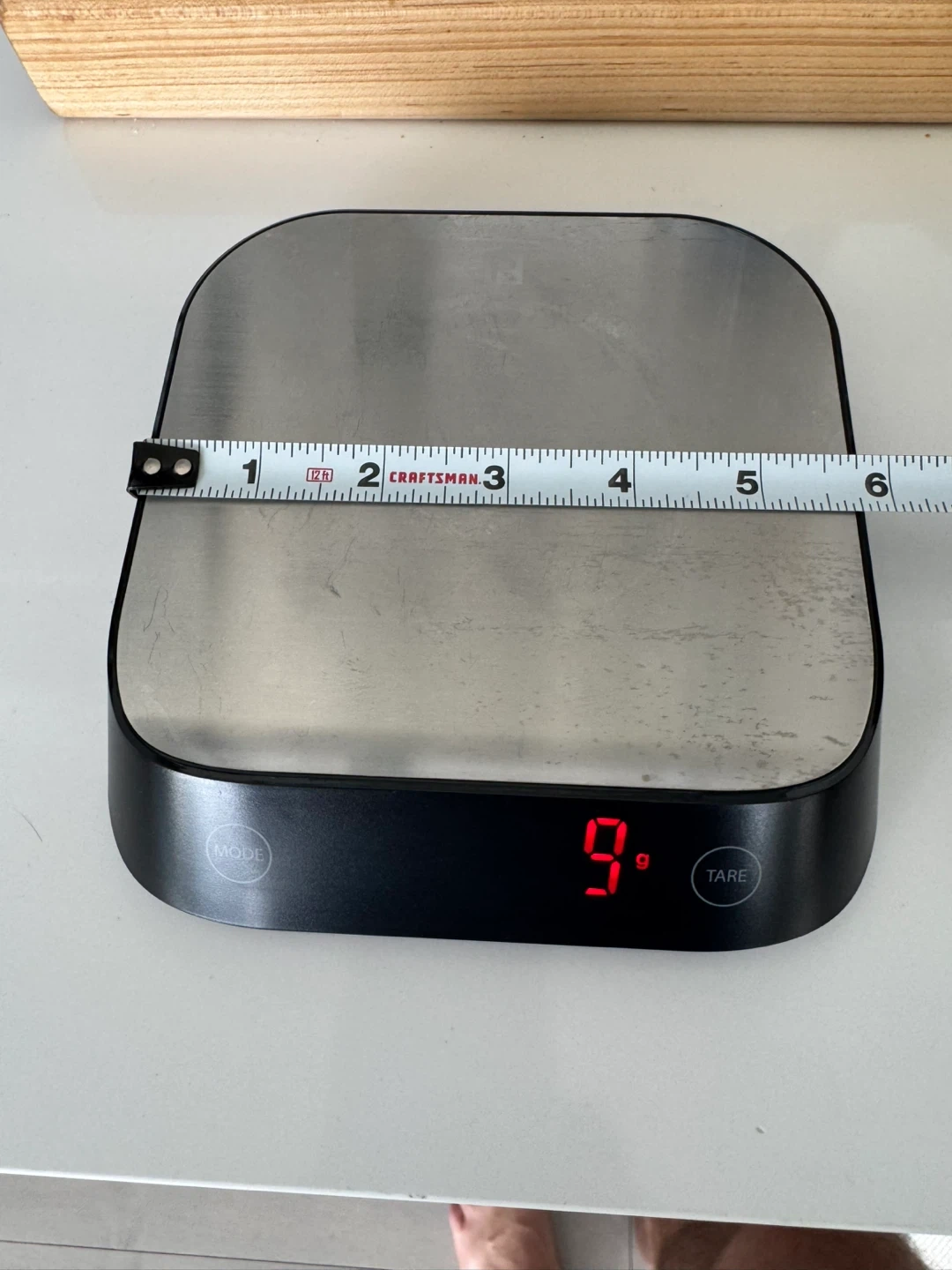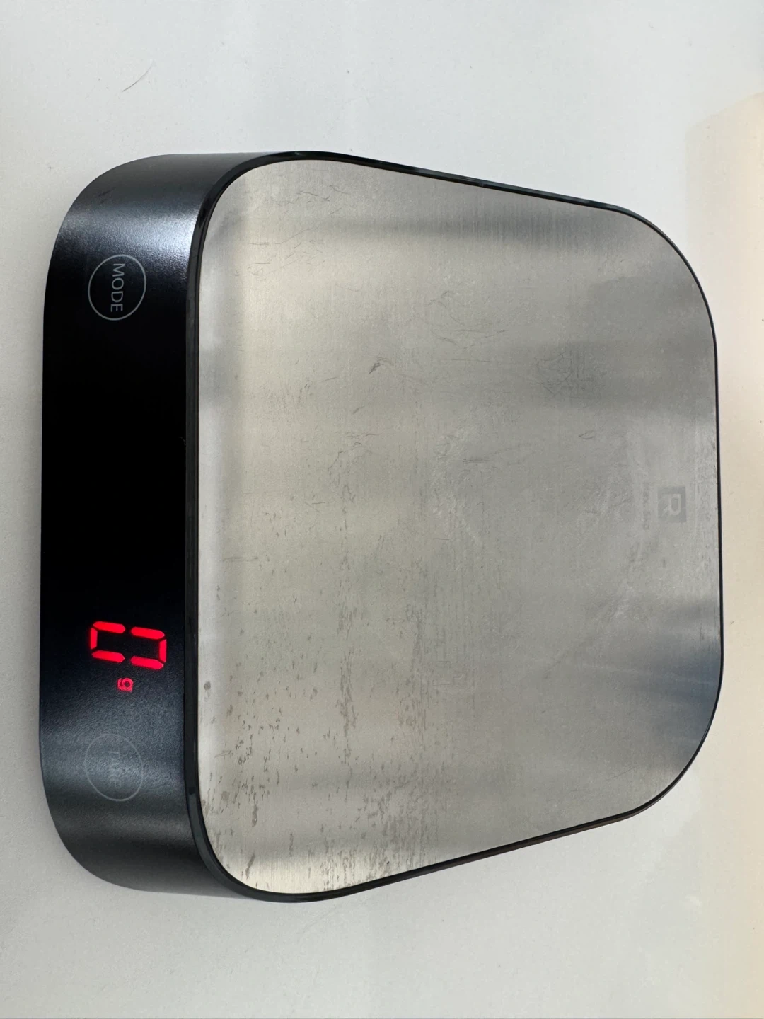 Selling a Refyne EP10 kitchen scale. It's in good condition and ready to help with your cooking and baking needs! It measures in grams, ounces and millilitres. Dimensions are approximately 6 inches by 6 inches.