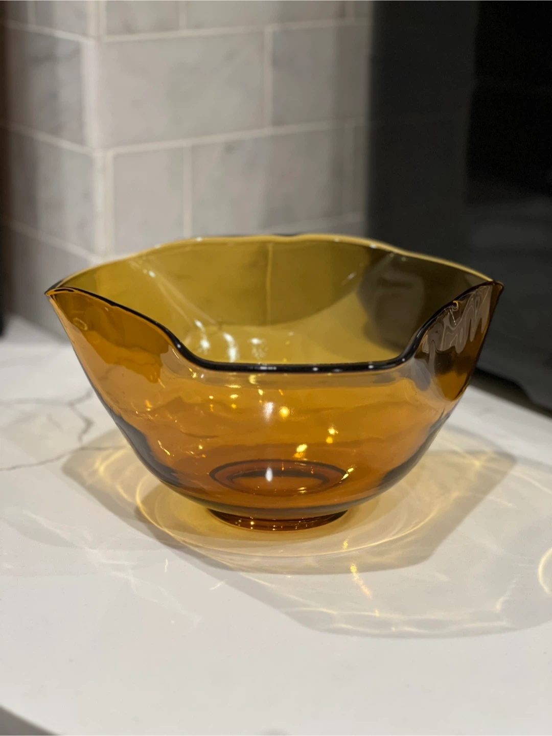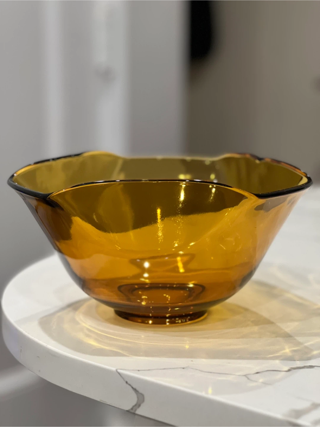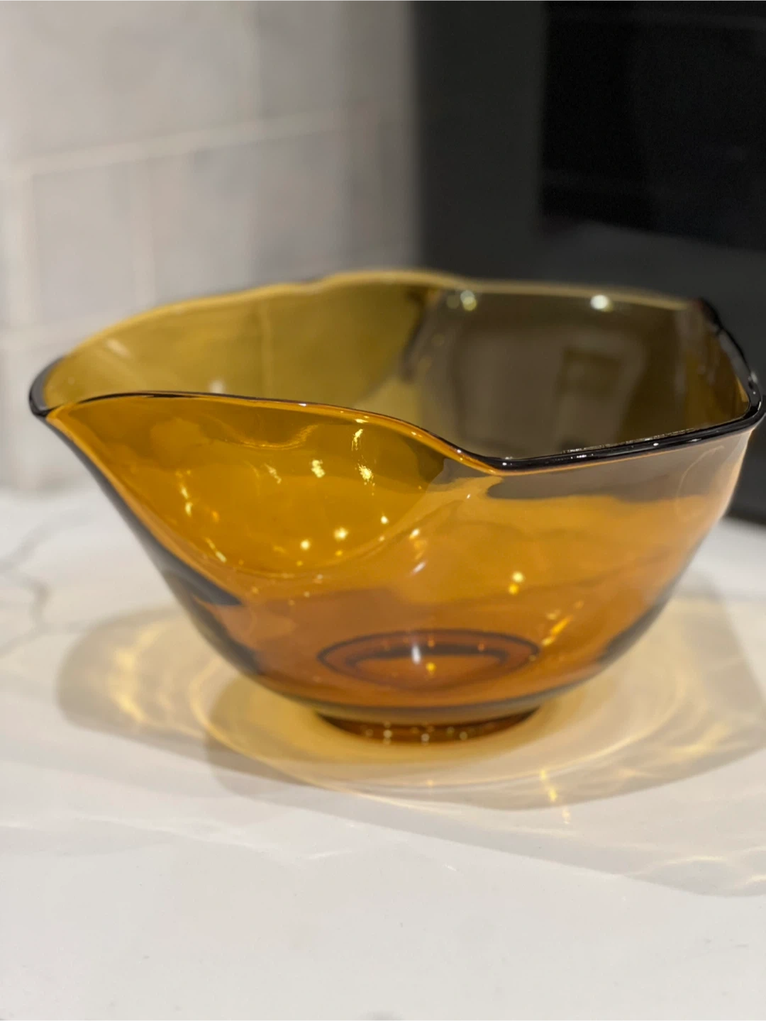 Add a touch of vintage elegance to your entertaining with this exquisite Anchor Hocking amber folded glass chip bowl. This stunning piece features a rich amber hue and a unique folded edge design, embodying the timeless style of mid-century glassware. Perfect for serving chips, snacks, or even as a decorative centerpiece, this bowl is both versatile and eye-catching. Elevate your next gathering with the warm, nostalgic charm of this vintage amber chip bowl.