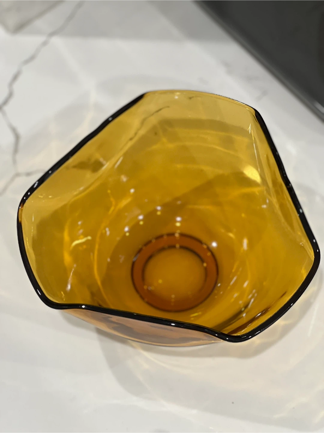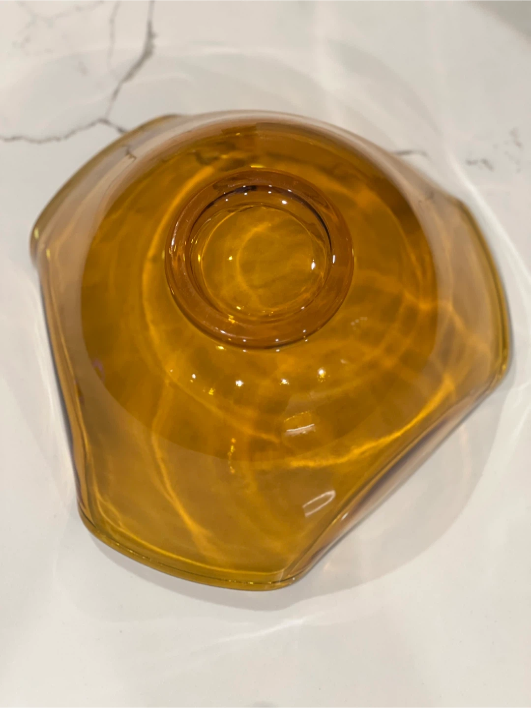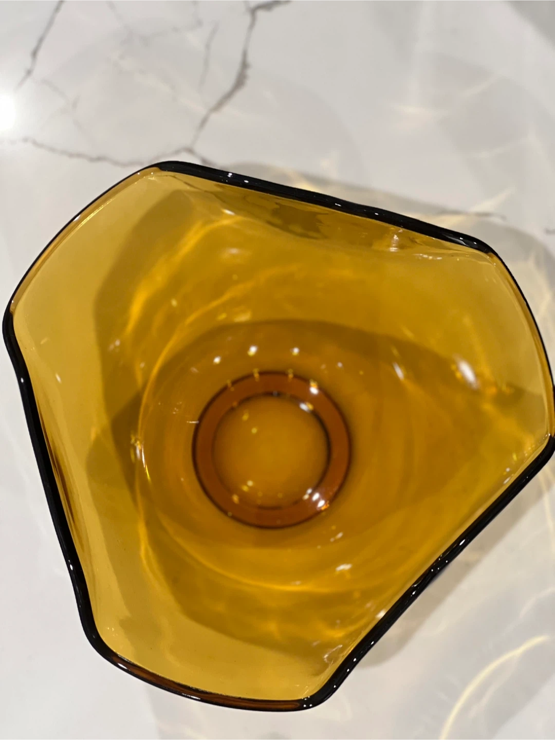 Add a touch of vintage elegance to your entertaining with this exquisite Anchor Hocking amber folded glass chip bowl. This stunning piece features a rich amber hue and a unique folded edge design, embodying the timeless style of mid-century glassware. Perfect for serving chips, snacks, or even as a decorative centerpiece, this bowl is both versatile and eye-catching. Elevate your next gathering with the warm, nostalgic charm of this vintage amber chip bowl.