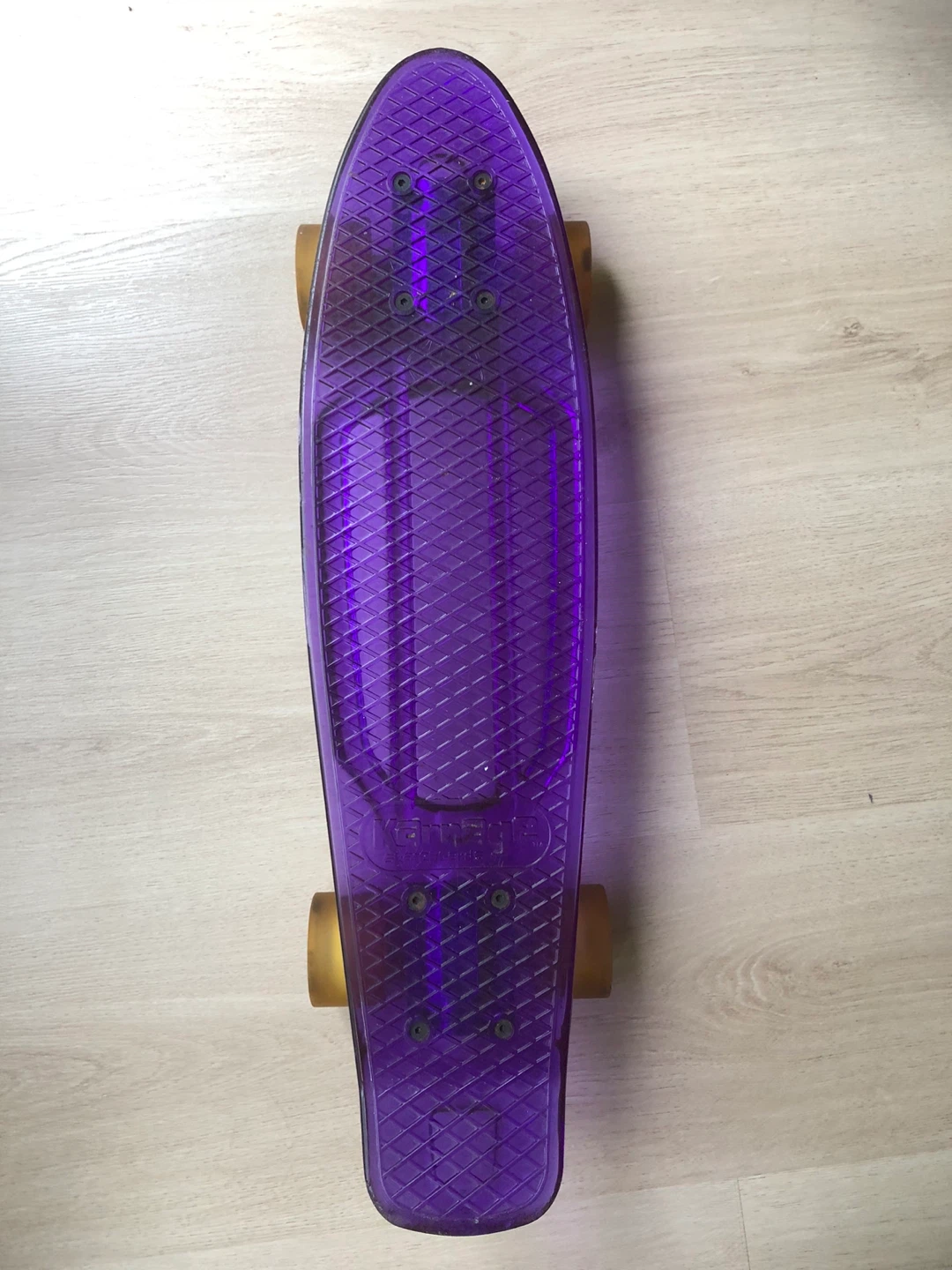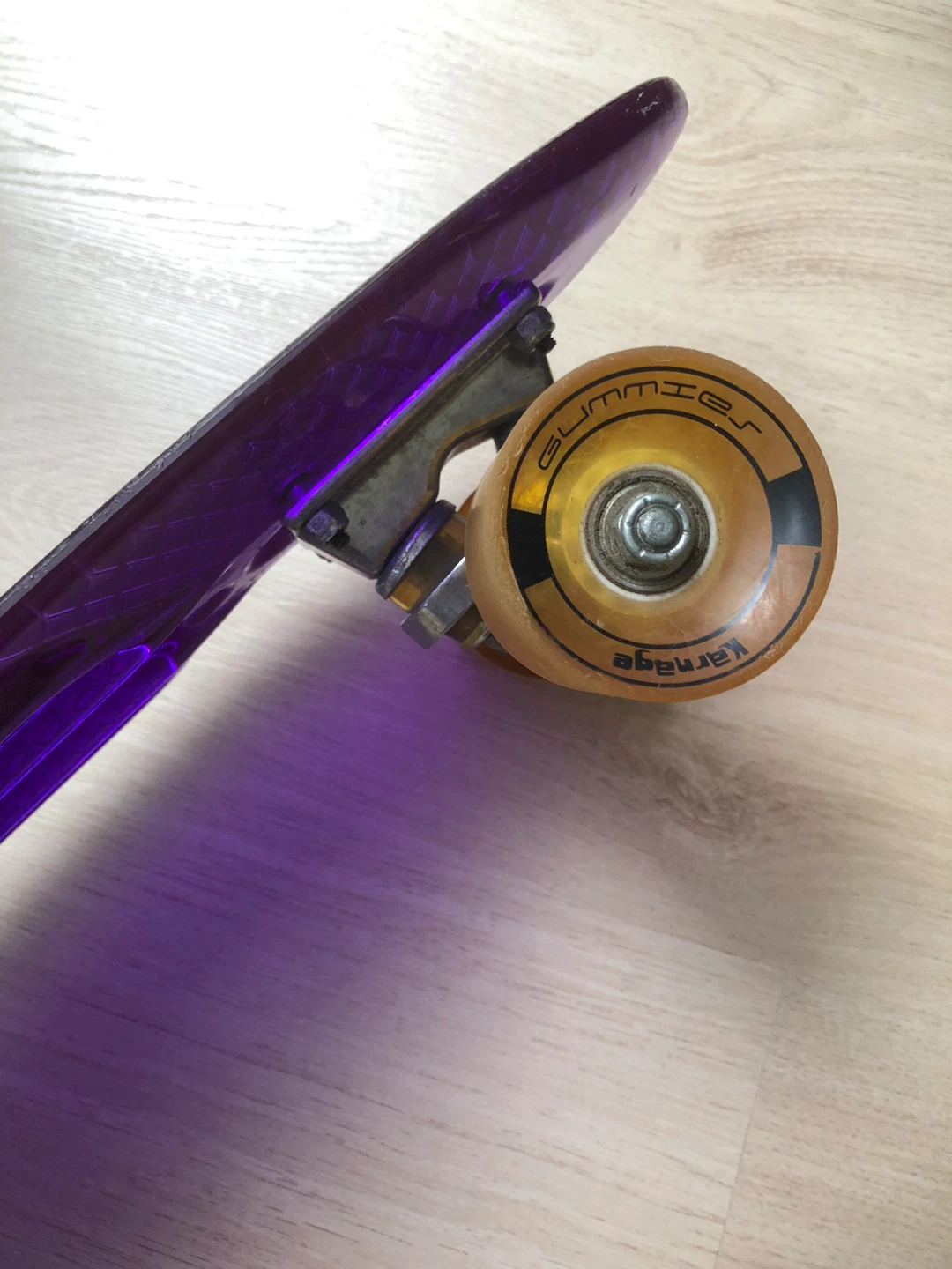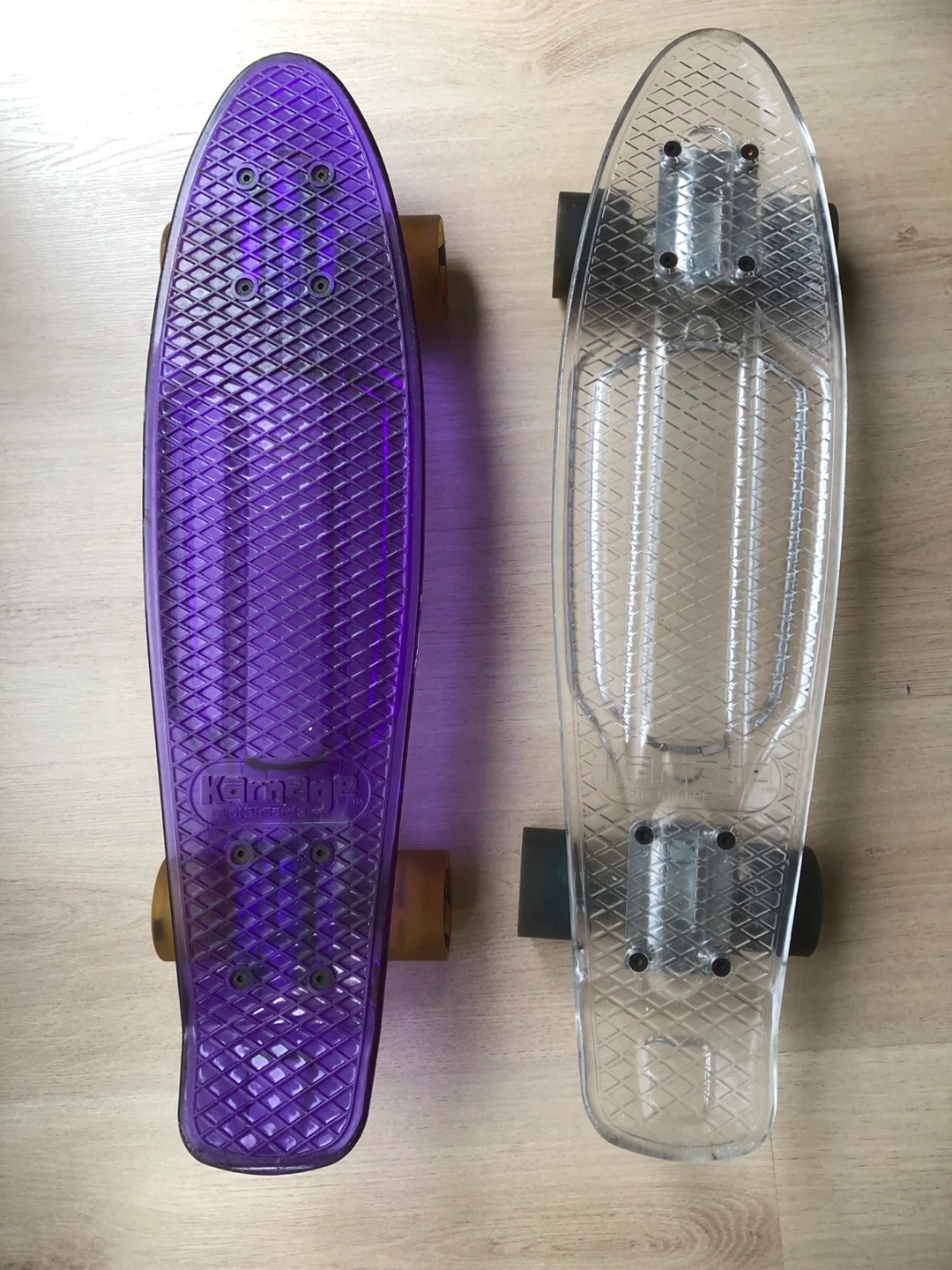 Selling a purple and clear Karnage Penny Skateboards. They are in good condition with minimal wear! The wheels are "Gummies" brand. $10 each. Message if you have any questions.