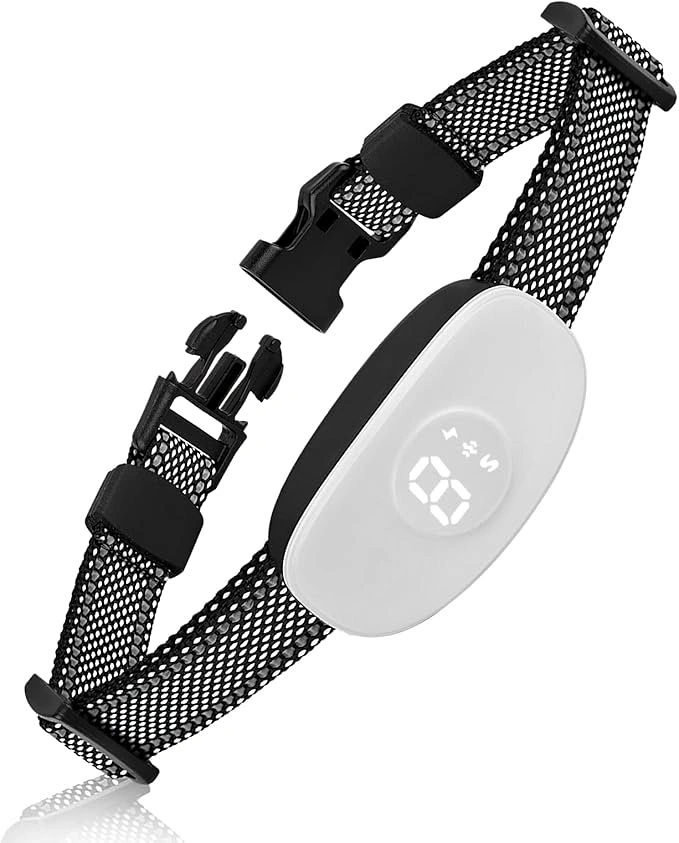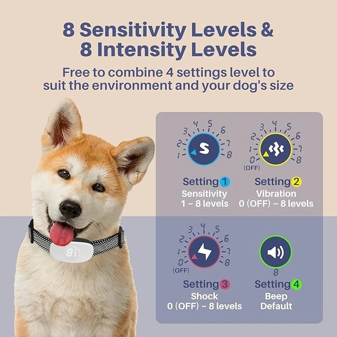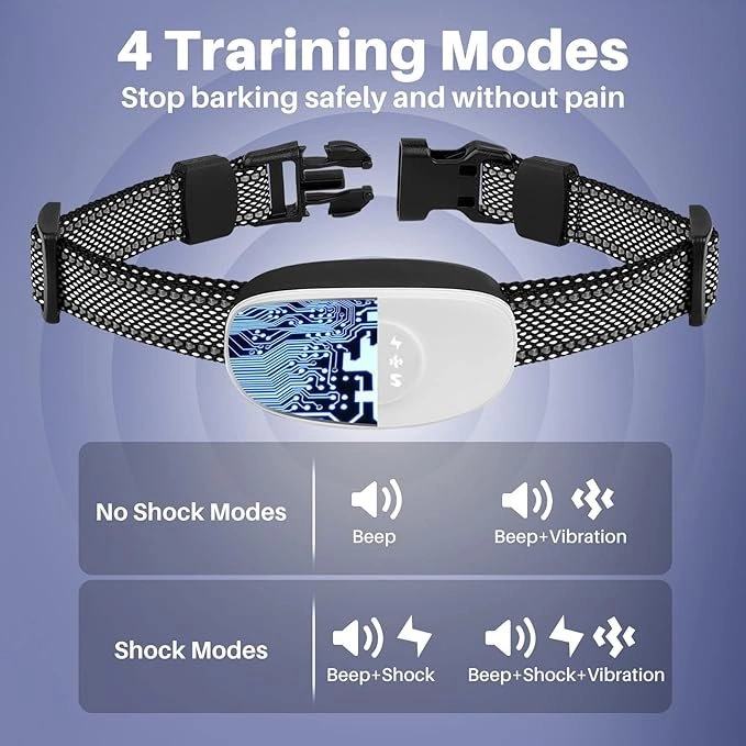 This is a fully automatic dog bark collar that supports 4 training modes, each mode has 8 intensity levels. All you need to do is to set a mode with a simple step, and then wear it around your dog's neck to effectively suppress your dog's unwanted barking. You can freely choose a no shock or shock mode by a simple interface. The anti bark dog collar uses advanced bark detection technology. With sensitivity levels 1-8 of the sensor, it is only activated when the dog wearing it barks. This technology safely and effectively filters out other dogs' barks and environmental noise, preventing false alarms and protecting your dog from unnecessary punishment. This dog no bark collar also allows you to adjust the sensitivity of the bark sensor. The bark sensor has 8 levels of sensitivity, you can choose the right sensitivity according to the environment and the dog's status and barking volume. When the device is triggered 7 times in a row, the anti barking device will enter a 1-minute protection state in which the anti barking device cannot be triggered. The bark training collar can be used continuously for 15 days when fully charged, which ensures continuity and effectiveness of training. It is recommended that you wear your dog for 6 hours a day for two weeks to ensure training effectiveness. It is recommended to gradually increase the intensity during the training process. The shock-conducting post of the bark collar can be removed. If you do not want to use the shock function, removing the shock post can reduce the discomfort of the neck. When you use the shock function, the attached soft silicone sleeve further reduces shock irritation and protects the neck from rubbing on the metal contacts. Please choose an effective and safe way to train your furry friend.