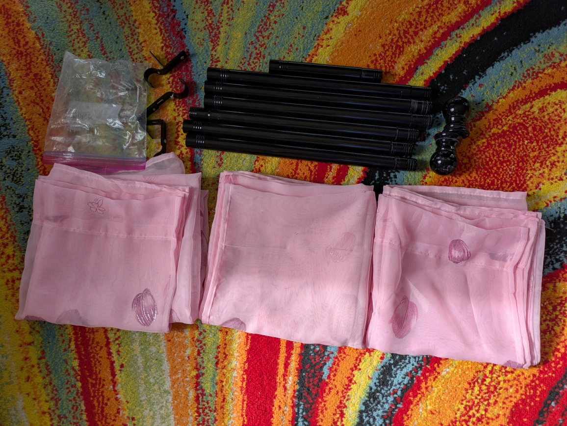 Selling a complete set of sheer pink curtains with a black curtain rod. Perfect for adding a touch of elegance to any room! Includes the curtains, rod, and all necessary hardware for easy installation. The curtains have a delicate floral pattern, and the rod is sturdy and stylish