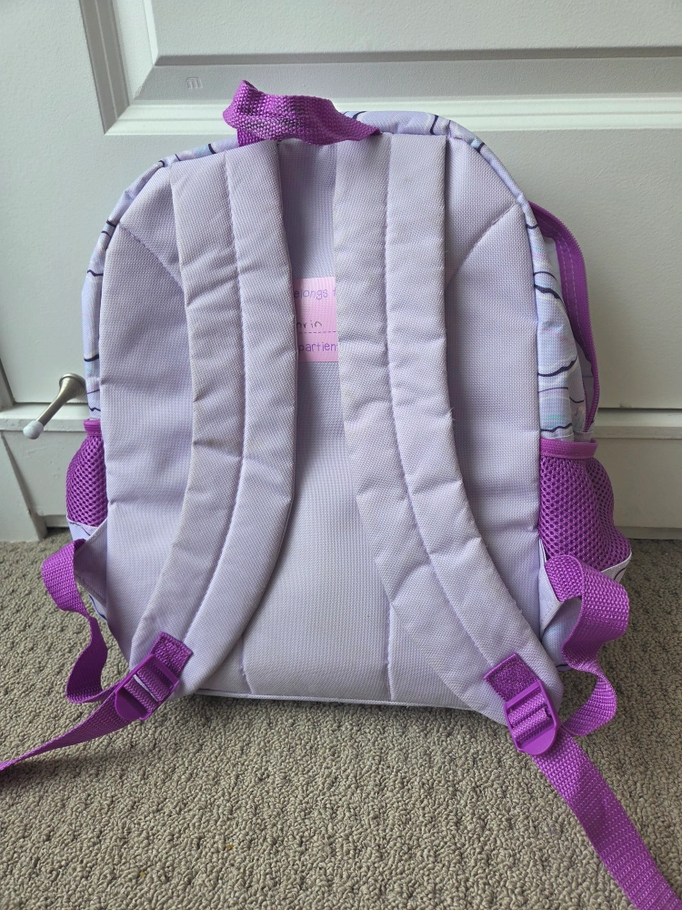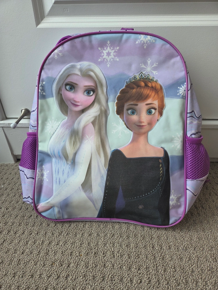 Selling a cute Disney Frozen backpack featuring Anna and Elsa! It's a lovely light purple colour with purple straps and trim. Perfect for any little Frozen fan!