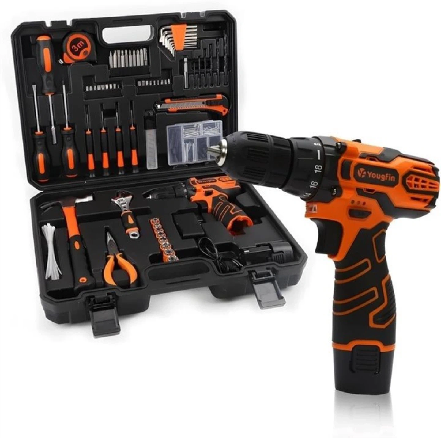 Selling a Yougfin cordless drill driver set. It comes with a variety of components to help you get the job done. Includes a drill, multiple screwdriver bits, a hammer, pliers, a wrench, a tape measure, and more, all neatly organized in a carrying case