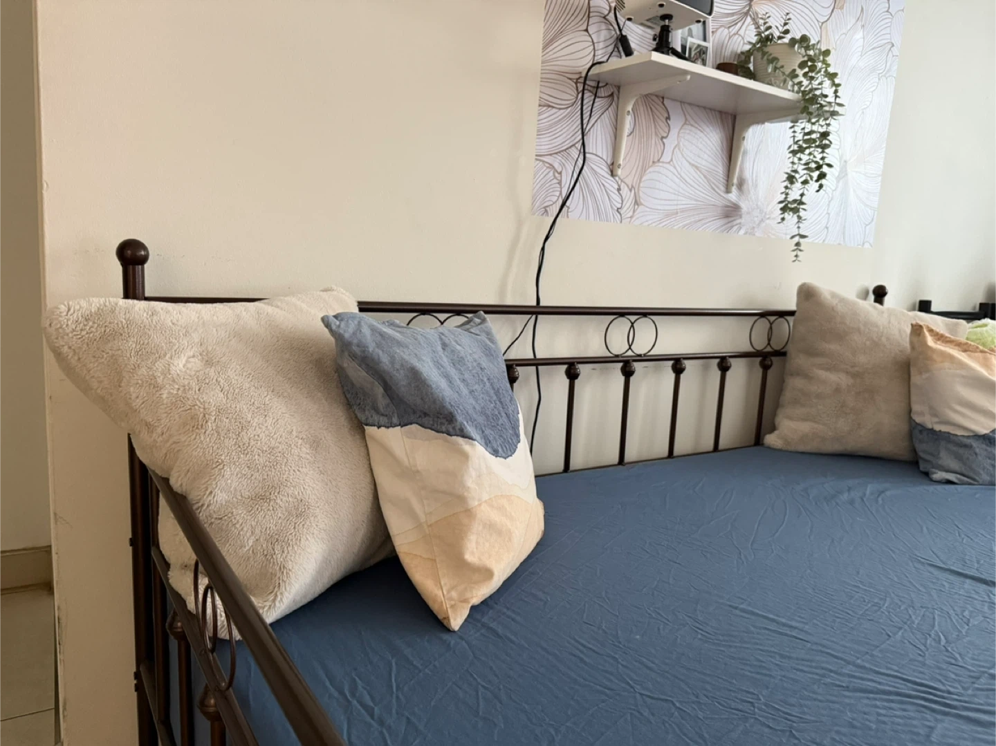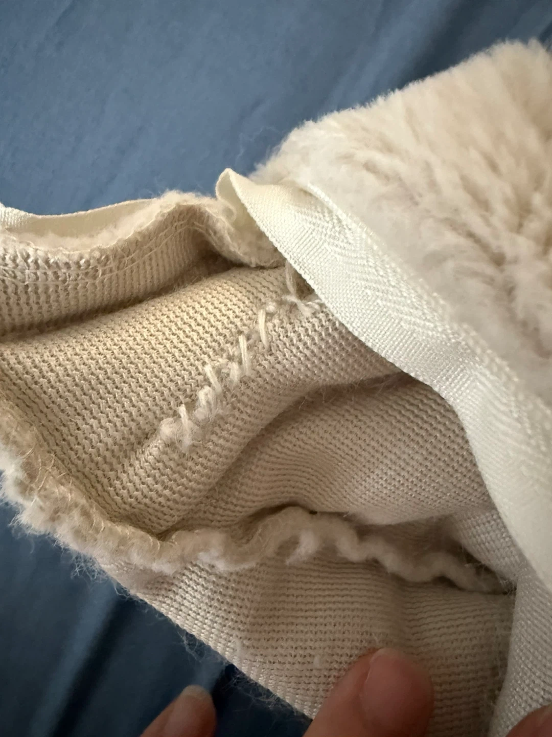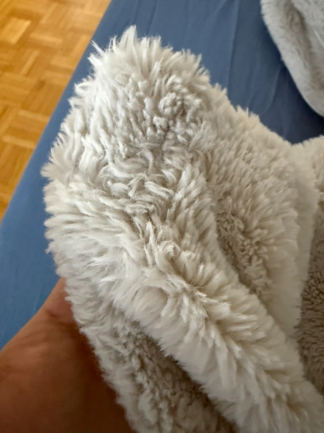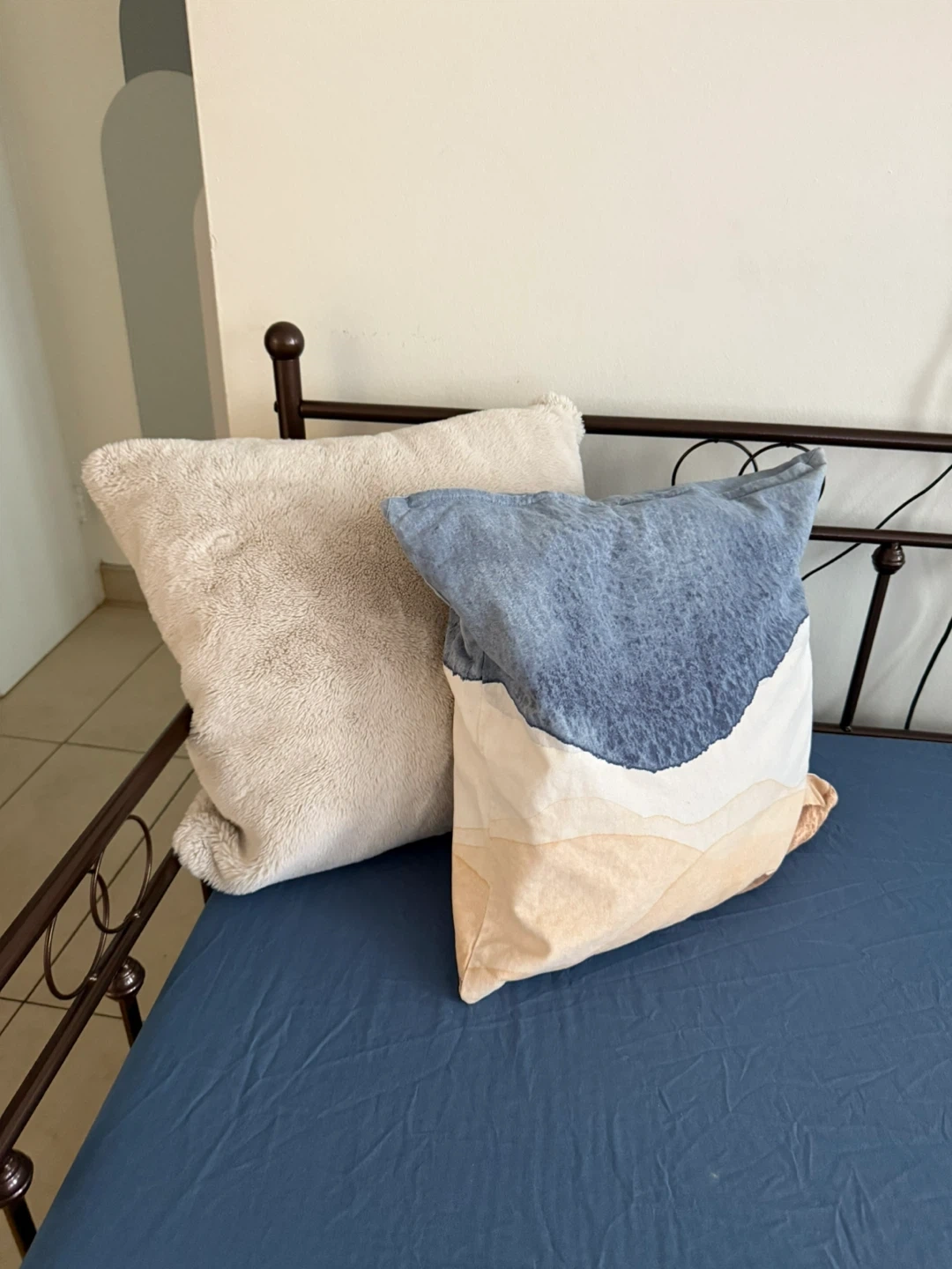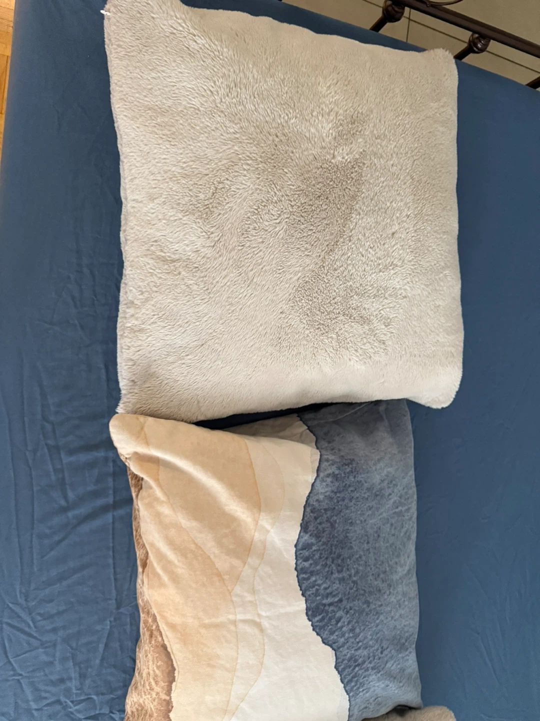 Selling a set of four decorative throw pillows! One set is a soft, fuzzy beige, and the other has a cool blue, white, and beige design. They're in great shape and would look lovely on a couch or bed.