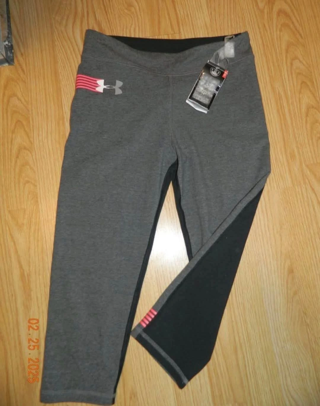 Here are some Under Armour leggings in grey with black accents. They appear to be in great condition and ready for a new home!