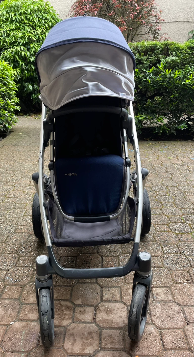 Selling a gently used UPPAbaby Vista stroller. It's in good condition and ready for a new family! The stroller features a navy blue seat and canopy with a silver frame. Perfect for navigating city streets or park trails with your little one. Including a bassinet.