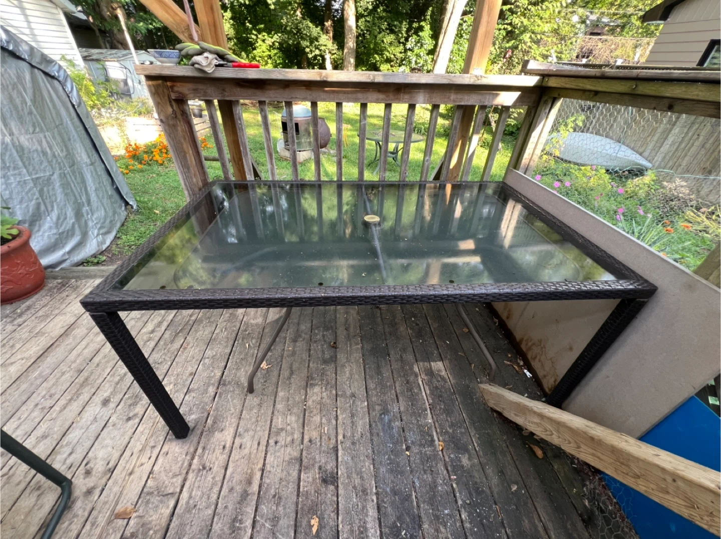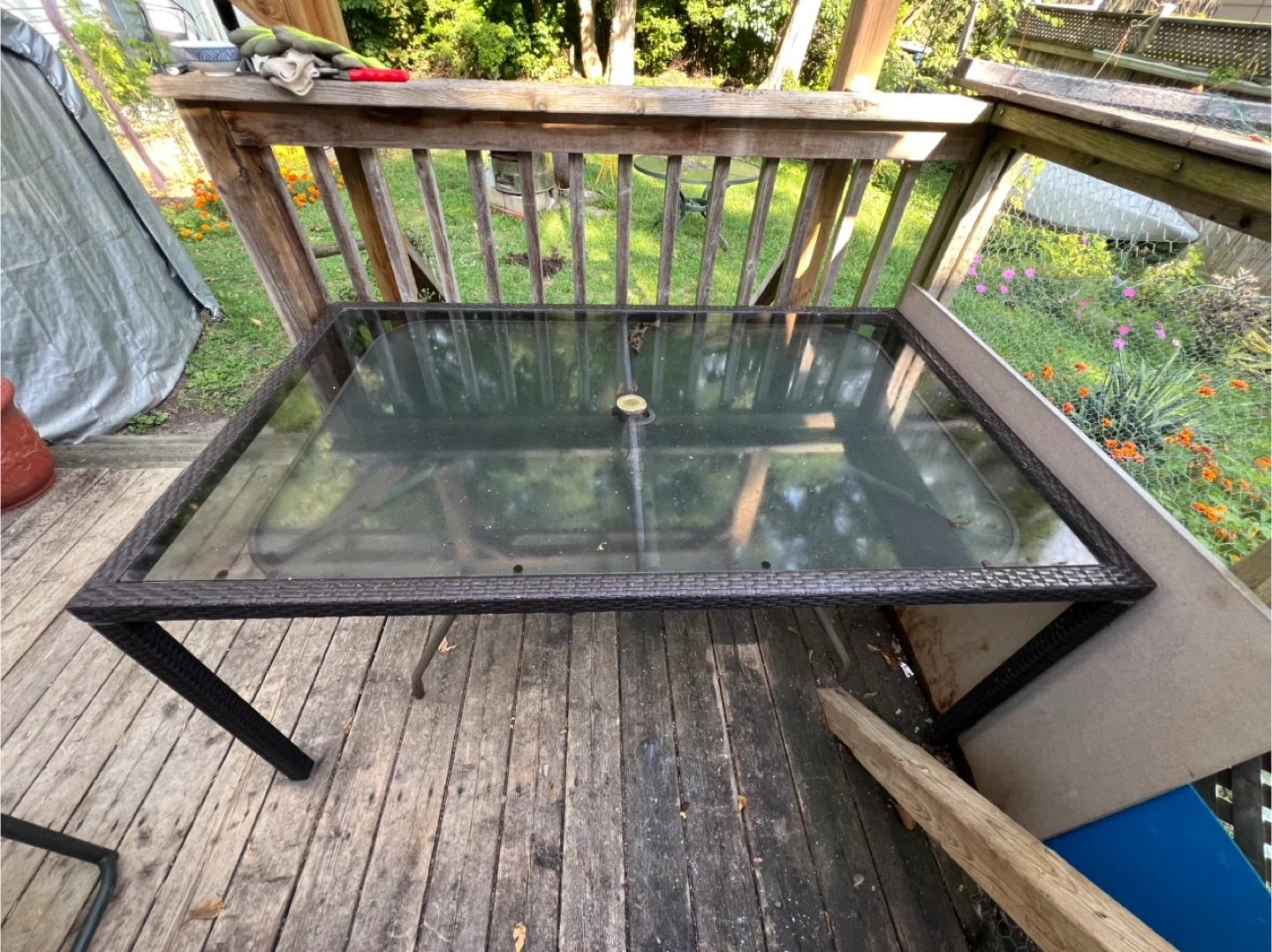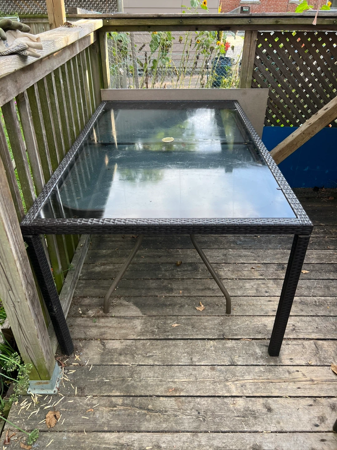 Selling a used outdoor patio table with a glass top. It has a dark wicker-style frame and sturdy legs. Perfect for enjoying meals or drinks outside!