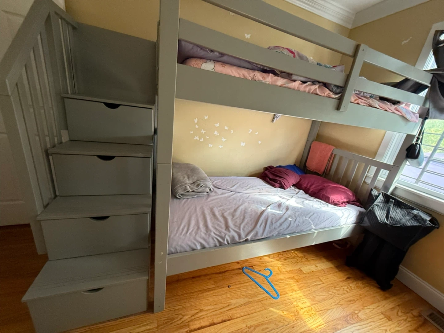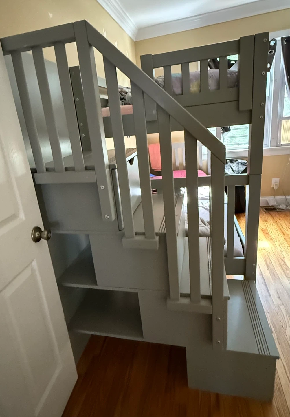 Selling a gray bunk bed that's in great shape! It features a staircase with built-in drawers for extra storage. Perfect for kids' rooms or guest rooms