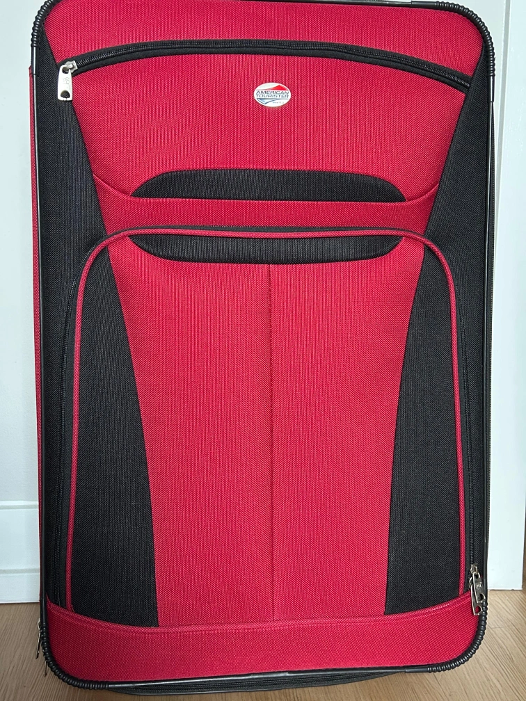 38moving out sale- Selling a once used American Tourister suitcase pack of 3 in red and black. It's in great shape and ready for your next trip!