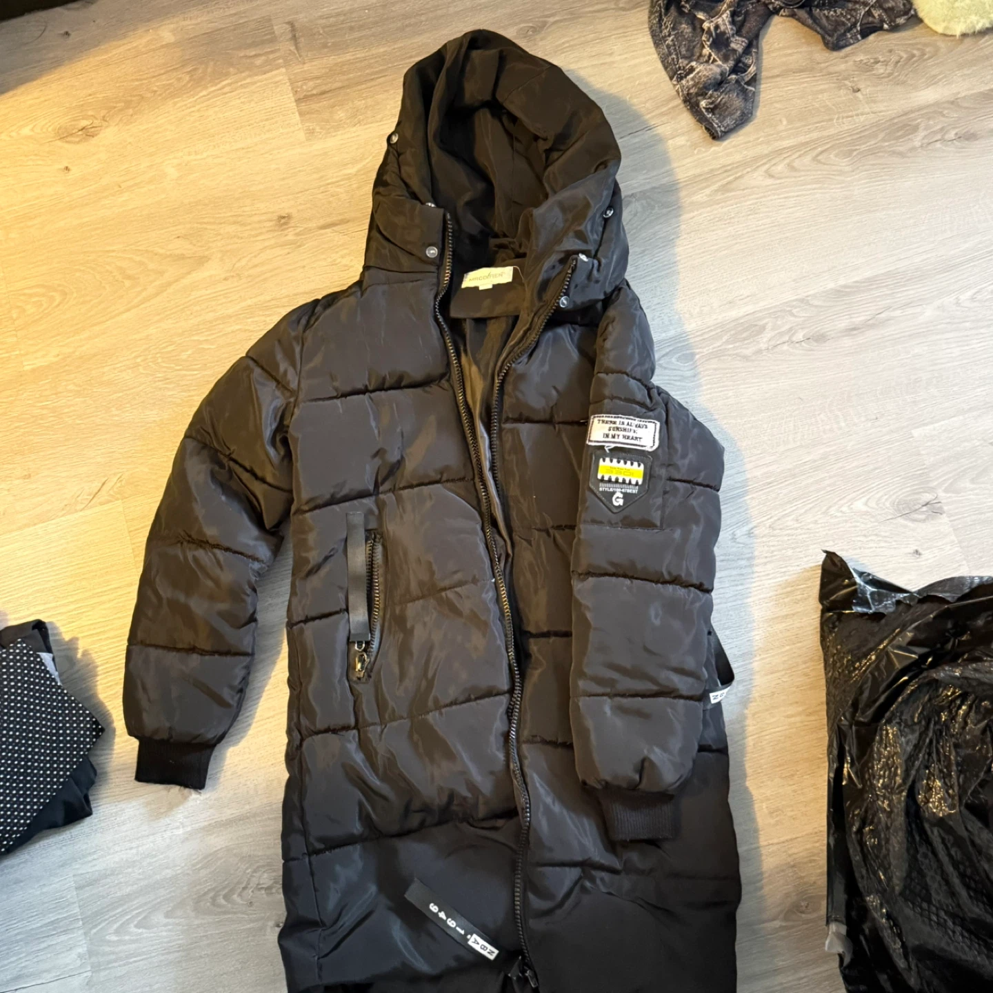 Here's a black puffer coat that's in great condition. It's perfect for staying warm during the colder months. There are some design details on the coat.