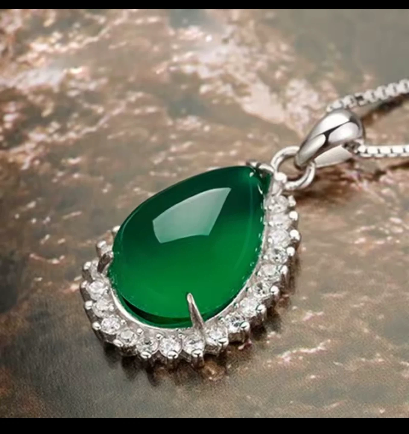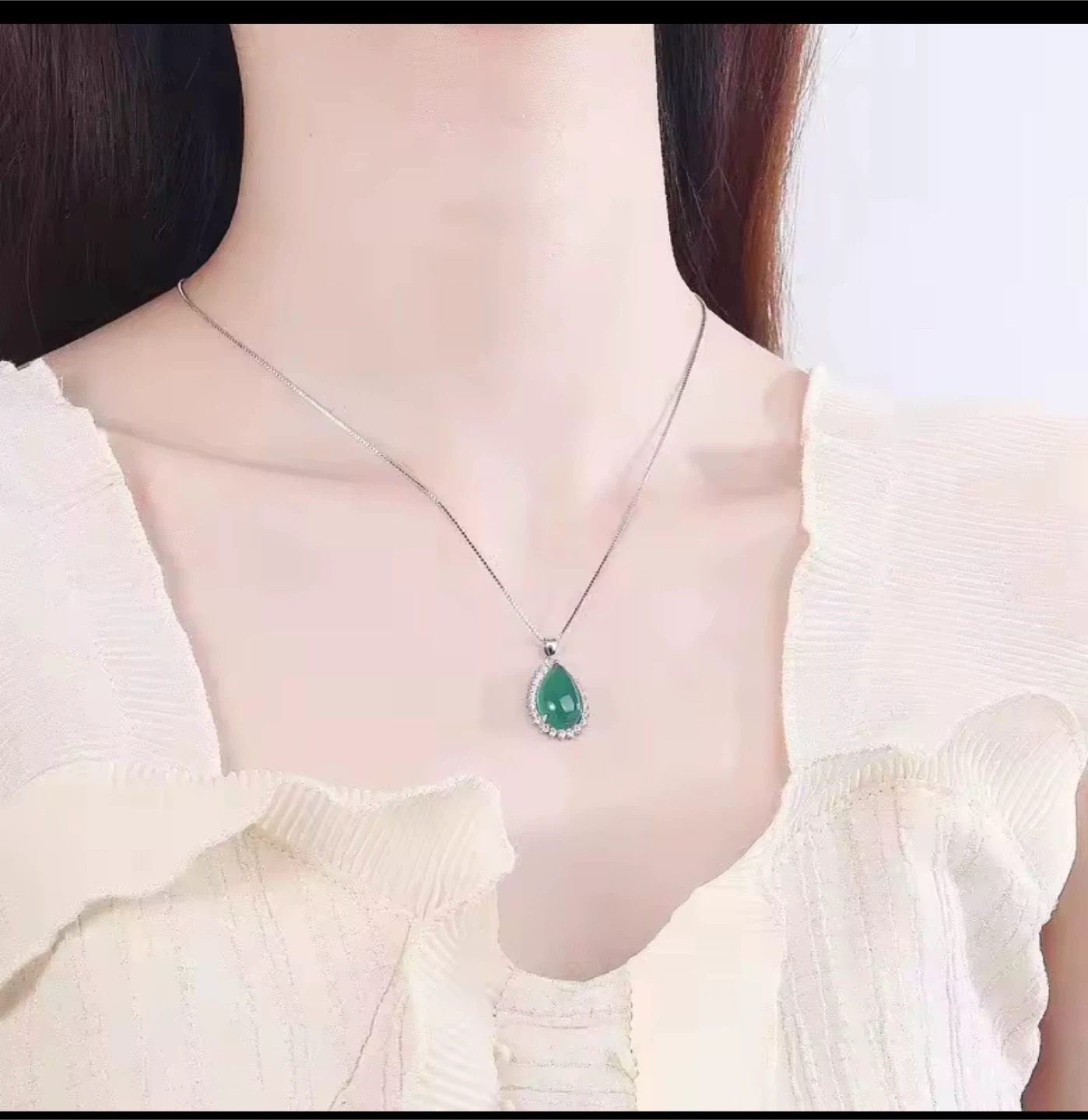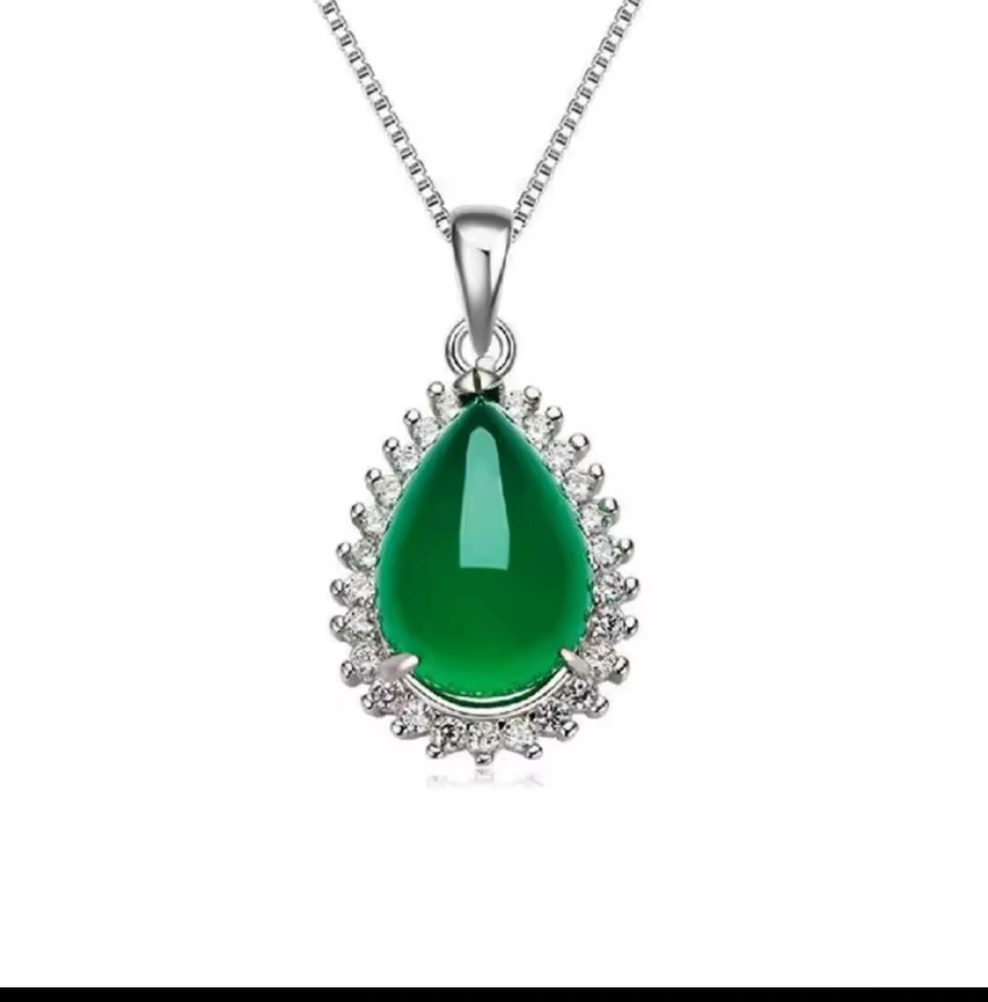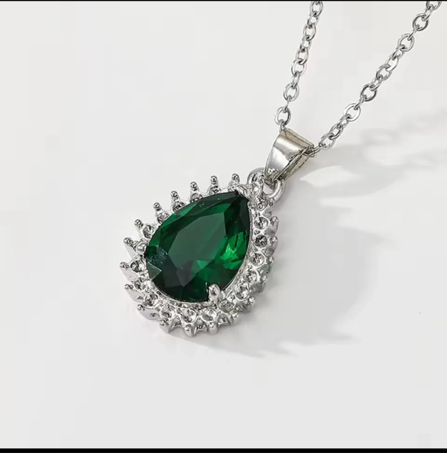 Selling a beautiful pendant necklace with a vibrant emerald green stone. The pendant is surrounded by sparkly accents and hangs from a delicate silver-tone chain. It's a lovely piece to add a pop of colour to any outfit!