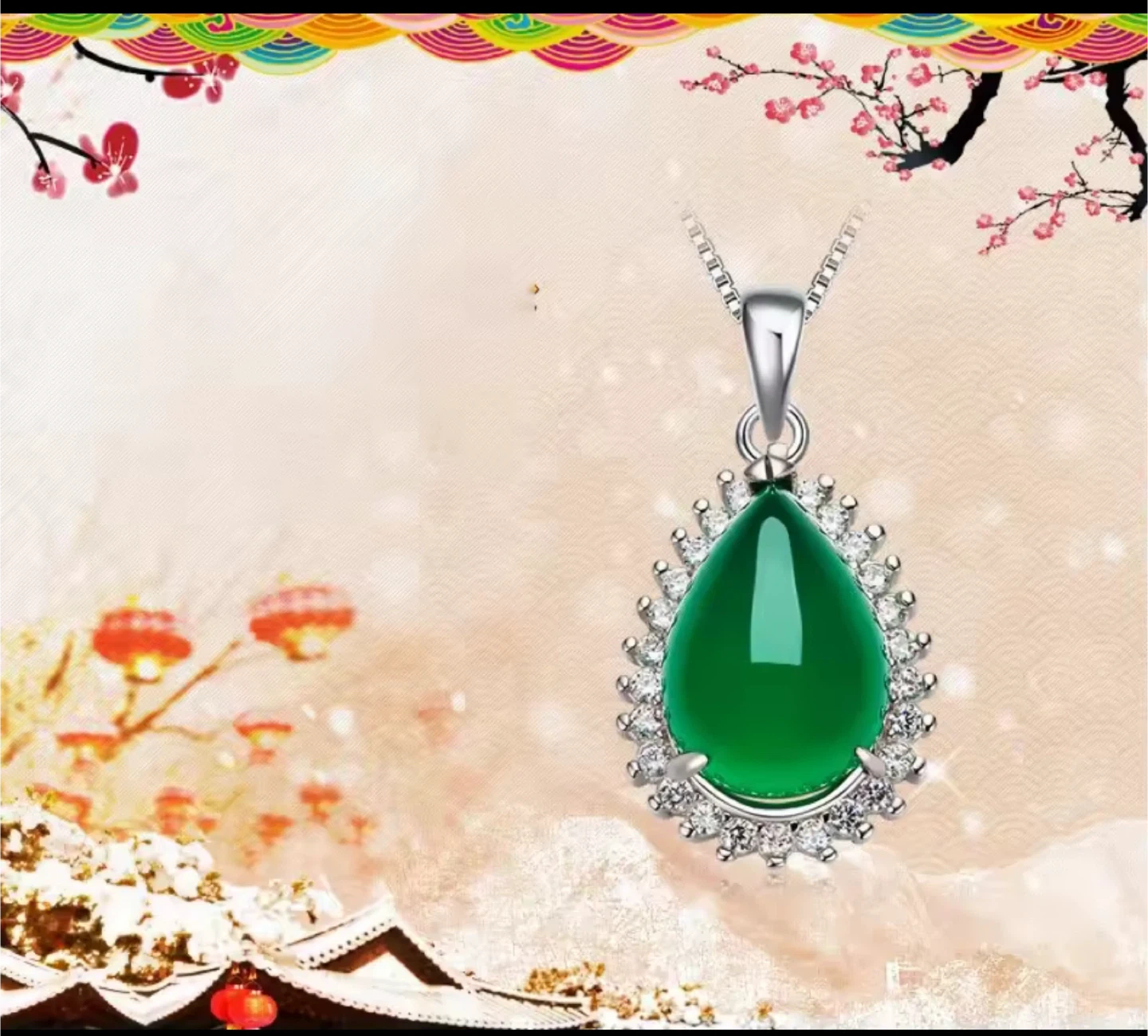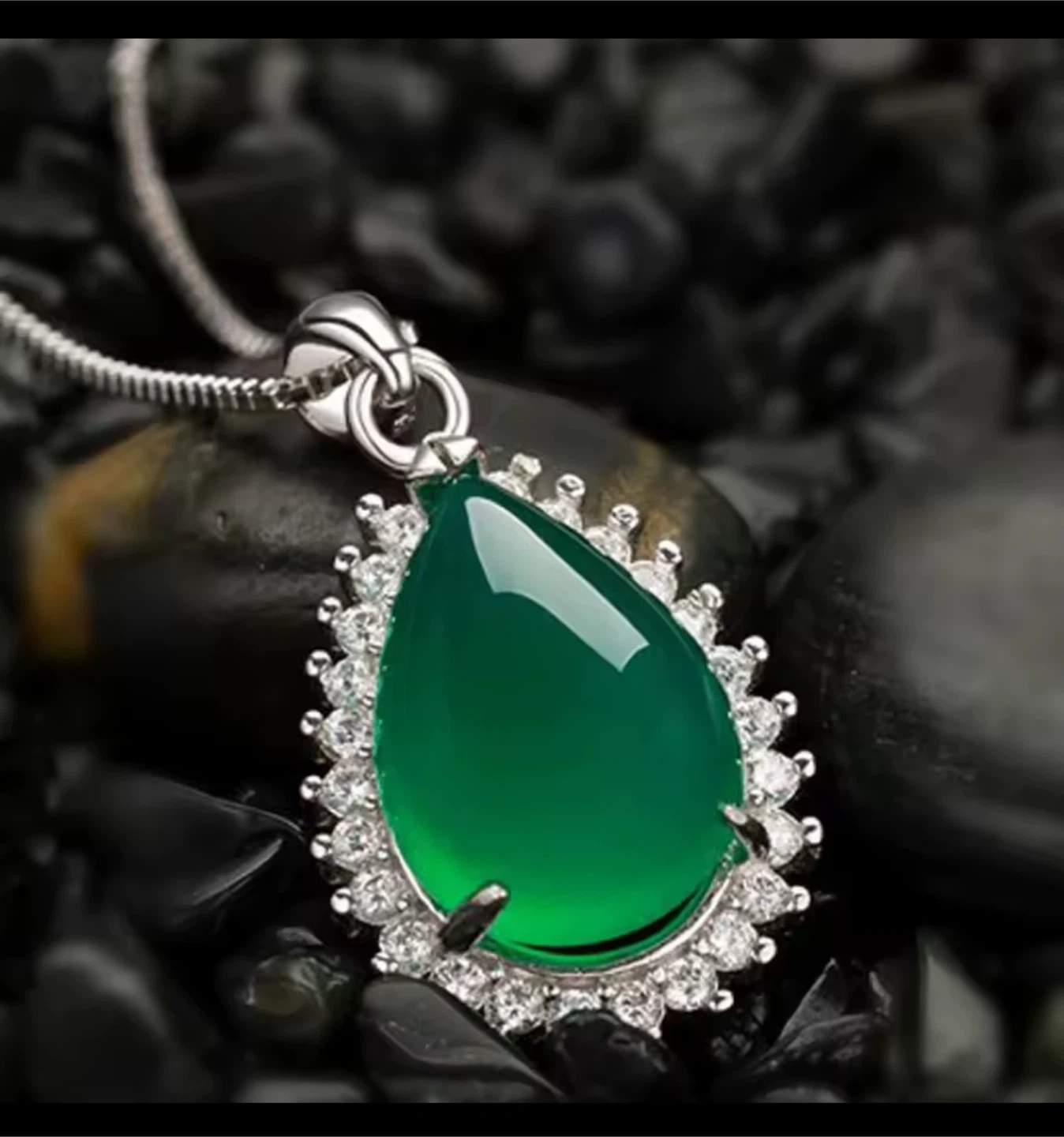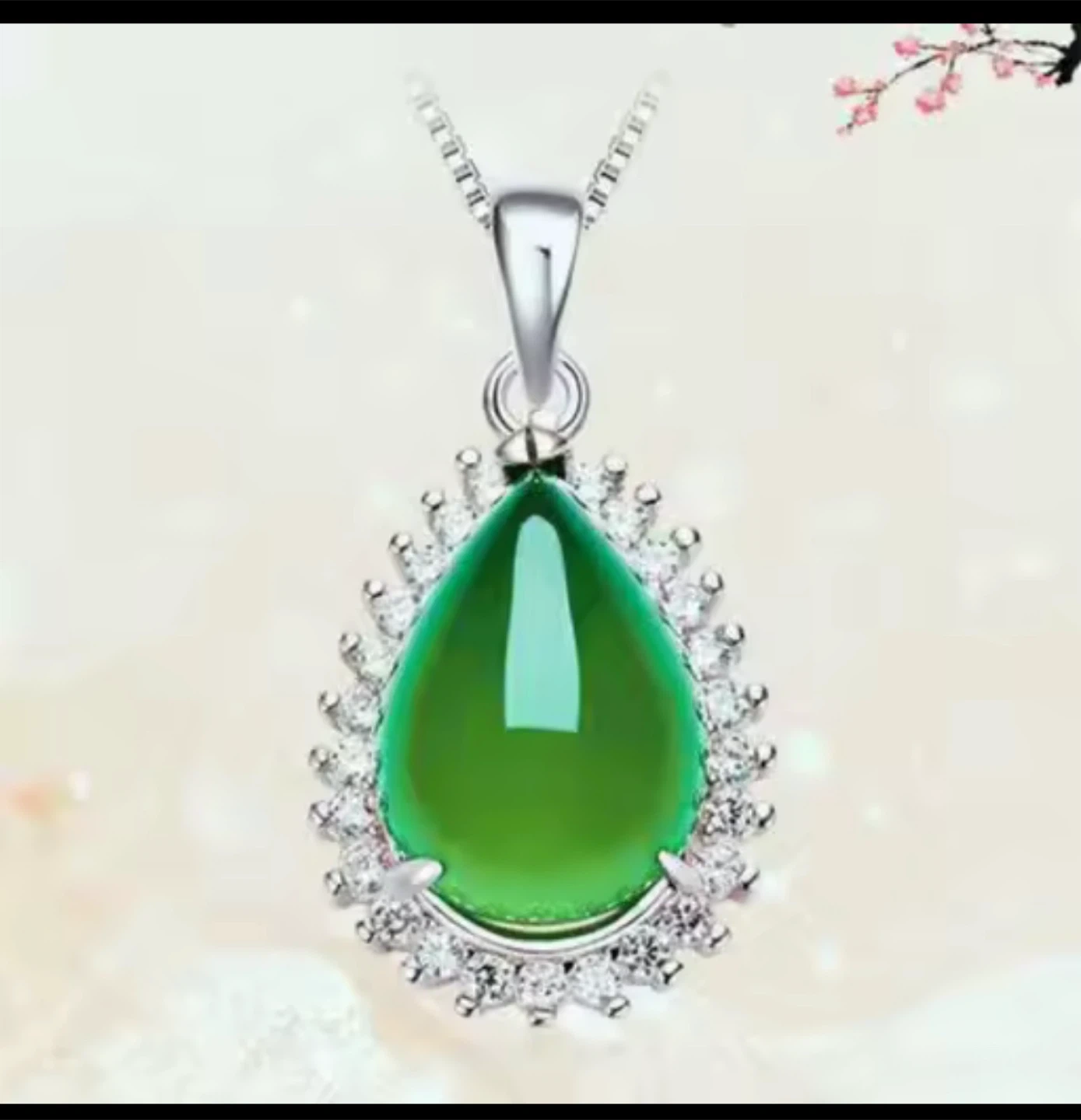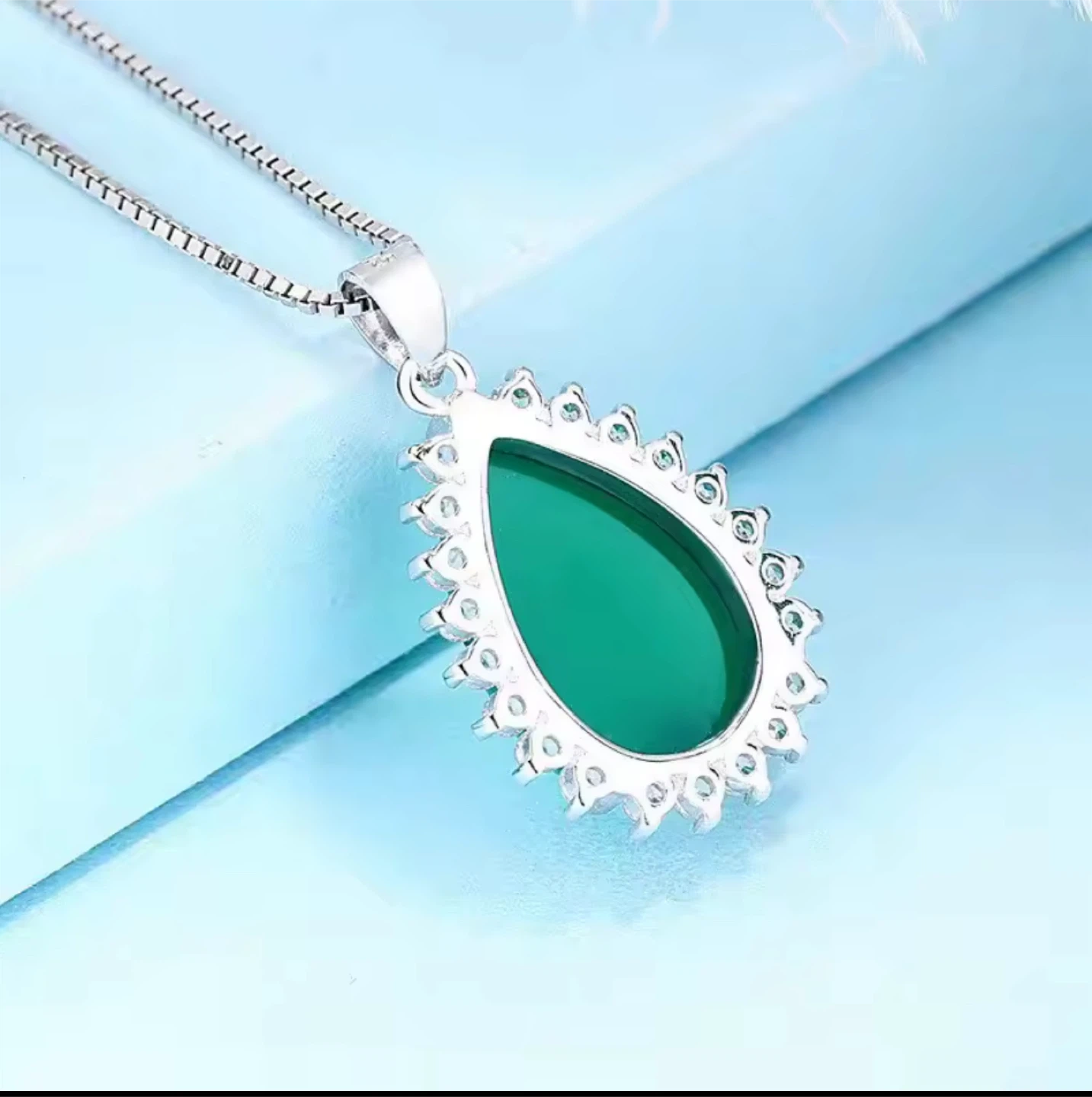 Selling a beautiful pendant necklace with a vibrant emerald green stone. The pendant is surrounded by sparkly accents and hangs from a delicate silver-tone chain. It's a lovely piece to add a pop of colour to any outfit!