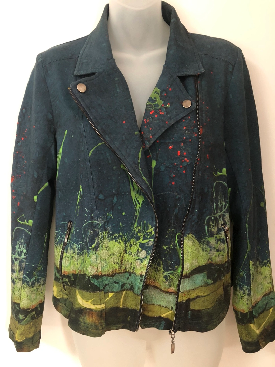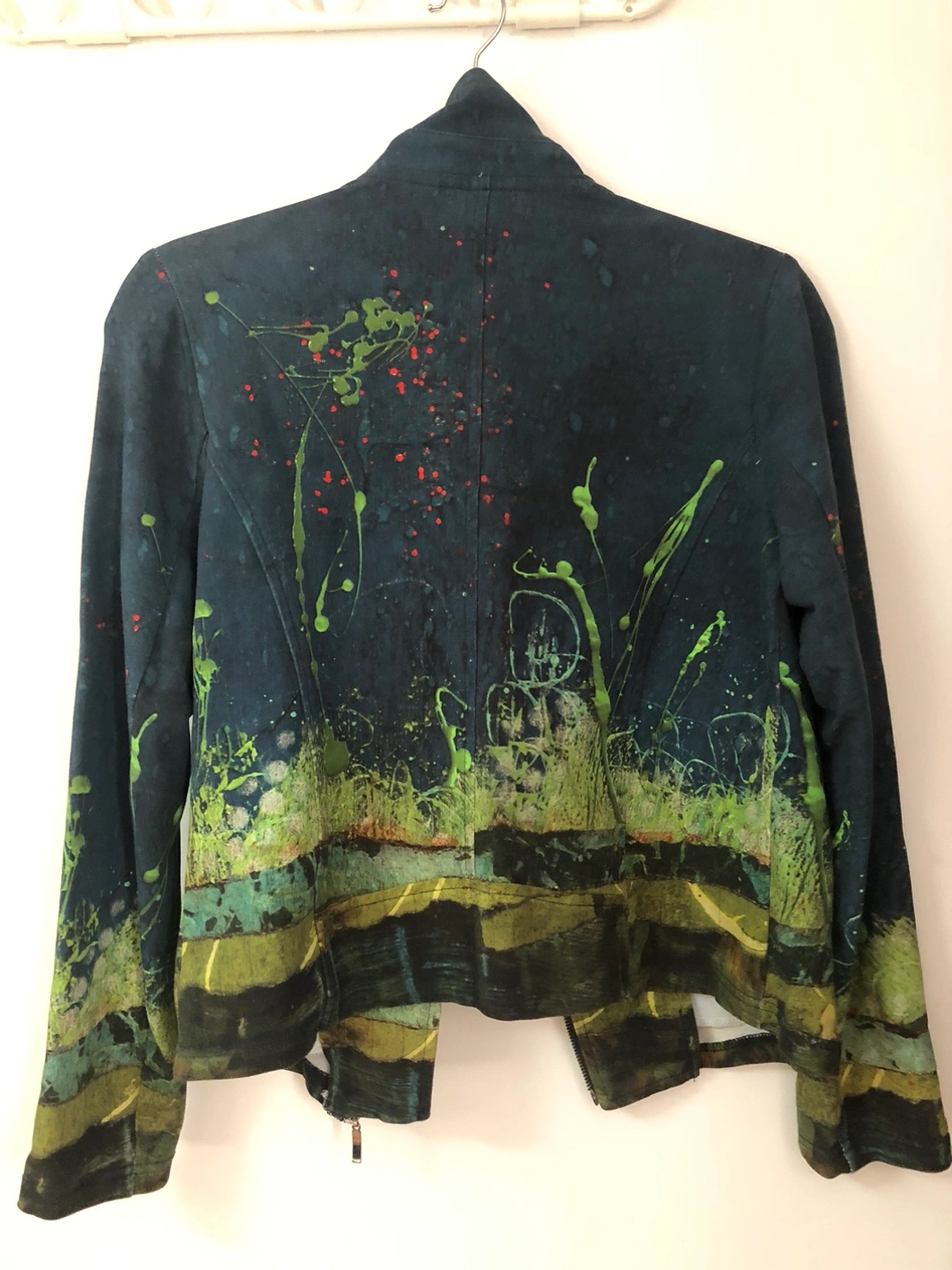 This Sympli jacket features a unique and eye-catching design! The blend of colours and artistic touches make it a standout piece. It's in great condition and ready to add some flair to your wardrobe