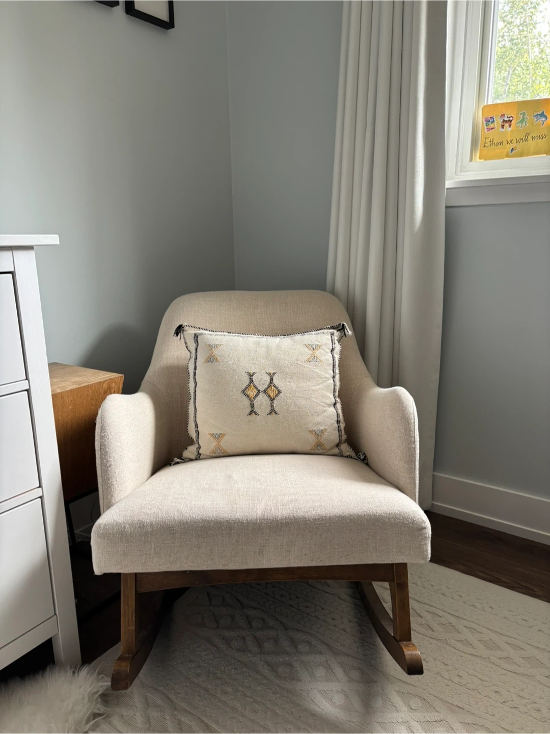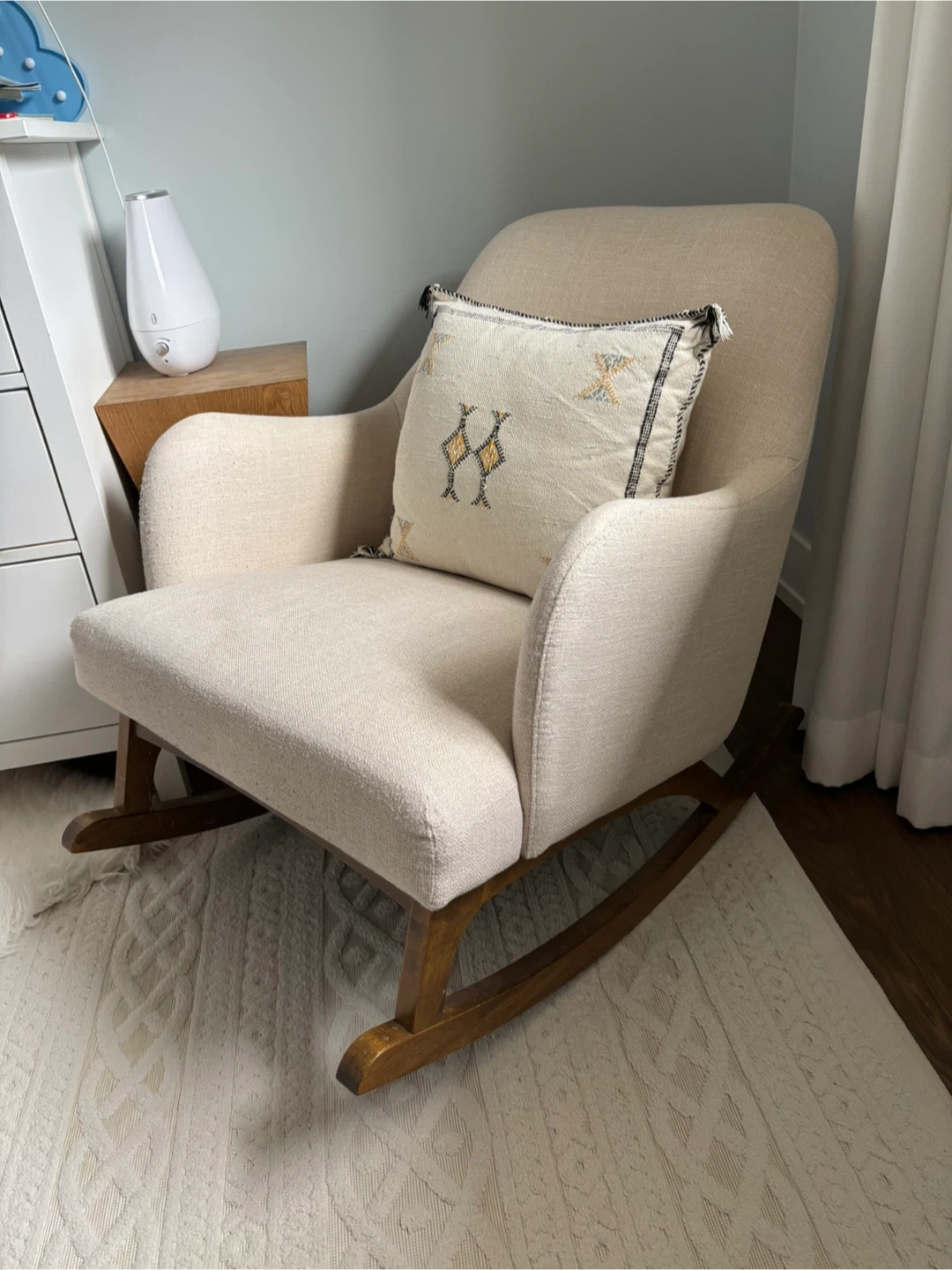Selling a Rocker in cream colour. It's in great condition and would be perfect for a nursery or living room. The rocker is comfortable and stylish, adding a touch of elegance to any space