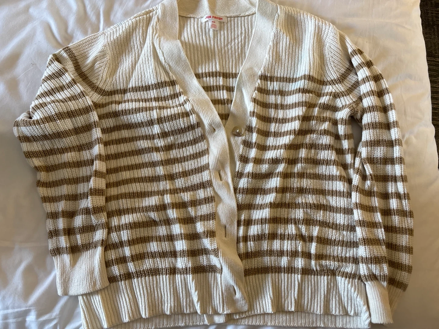 Here's a Joe Fresh cardigan in size medium! It's a cream colour with brown stripes, perfect for layering. It's in great condition and has a classic, comfortable fit