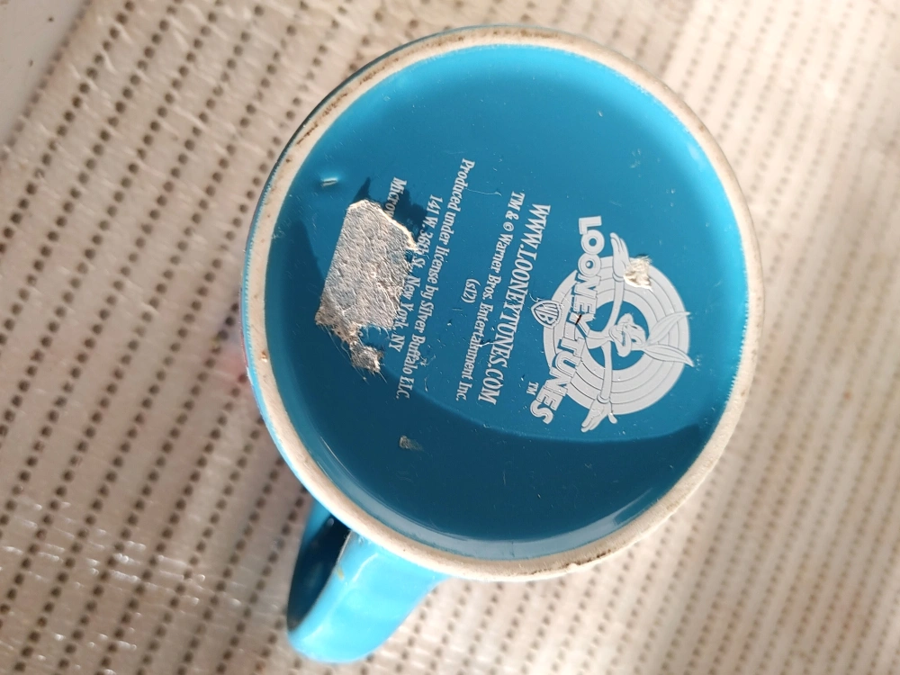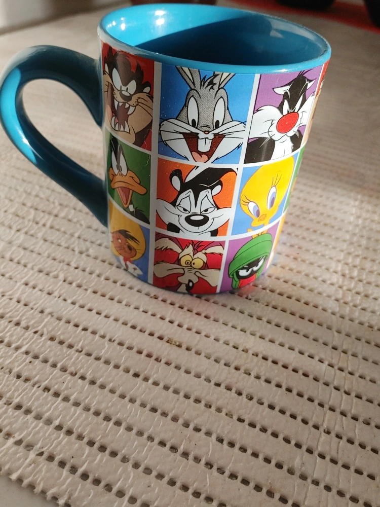 I'm selling a Looney Tunes mug featuring Bugs Bunny, Sylvester, Daffy Duck, Pepe Le Pew, Tweety Bird, Wile E. Coyote, and Marvin the Martian! The mug is in good condition and has a blue handle and interior
