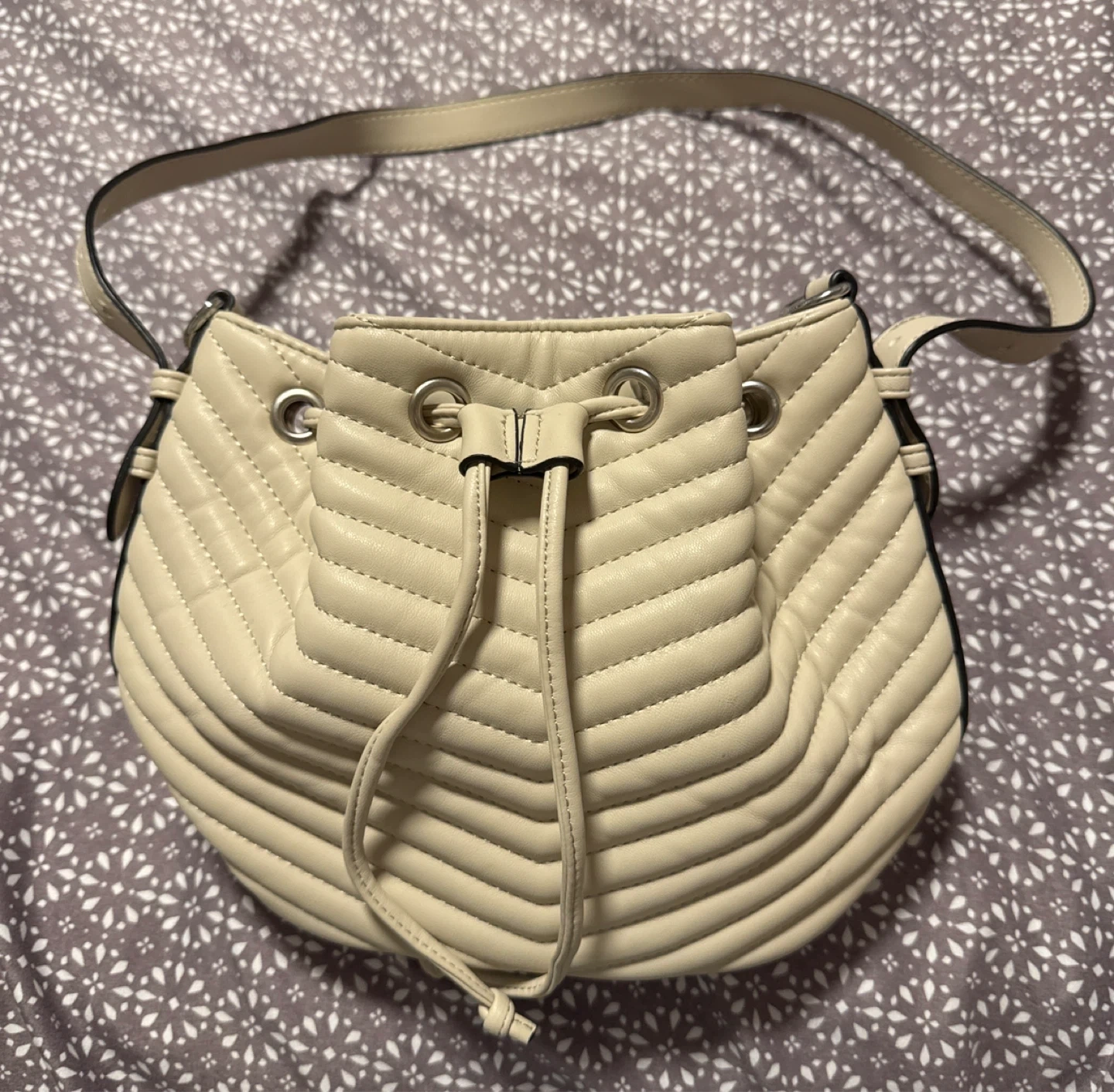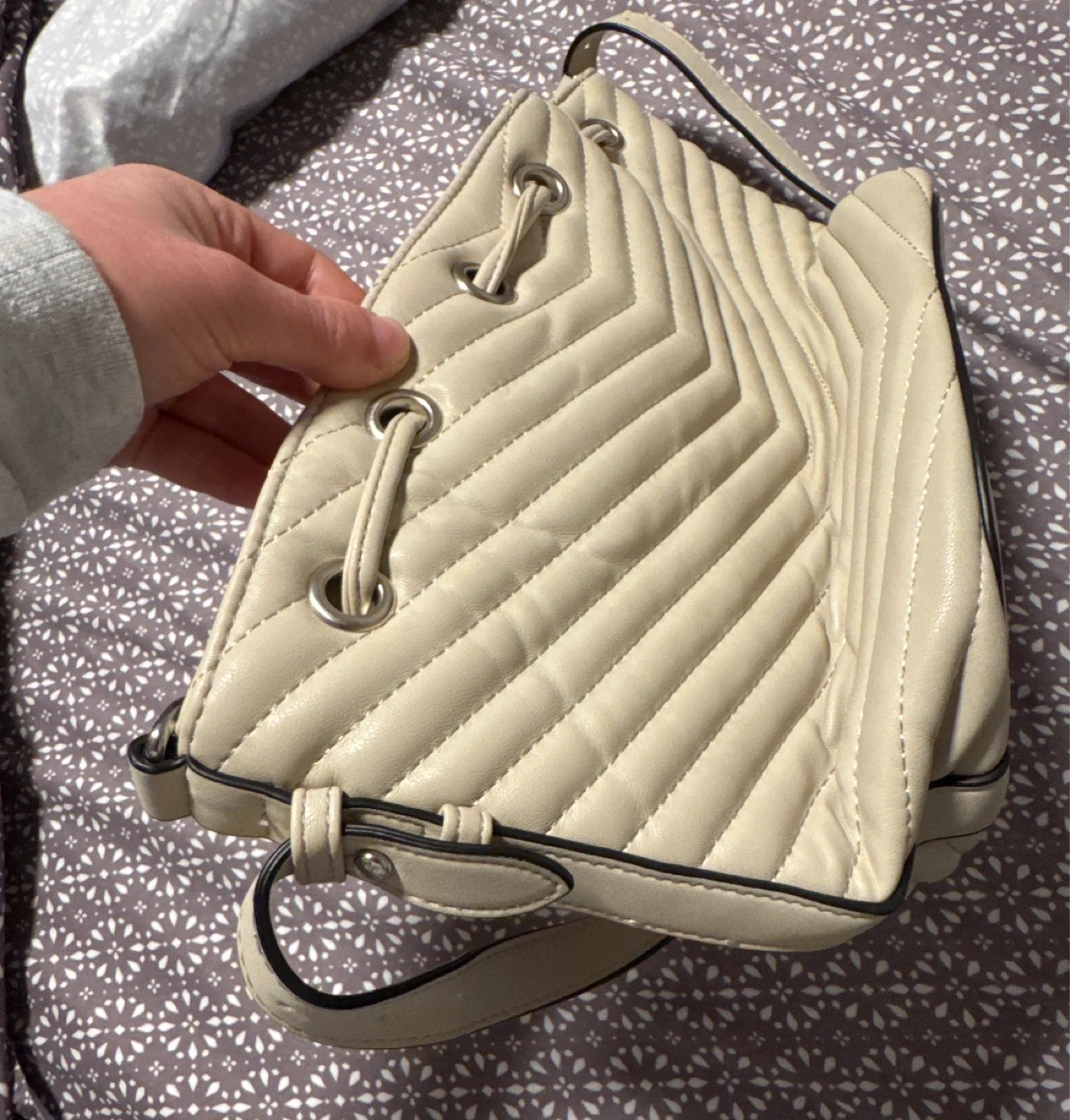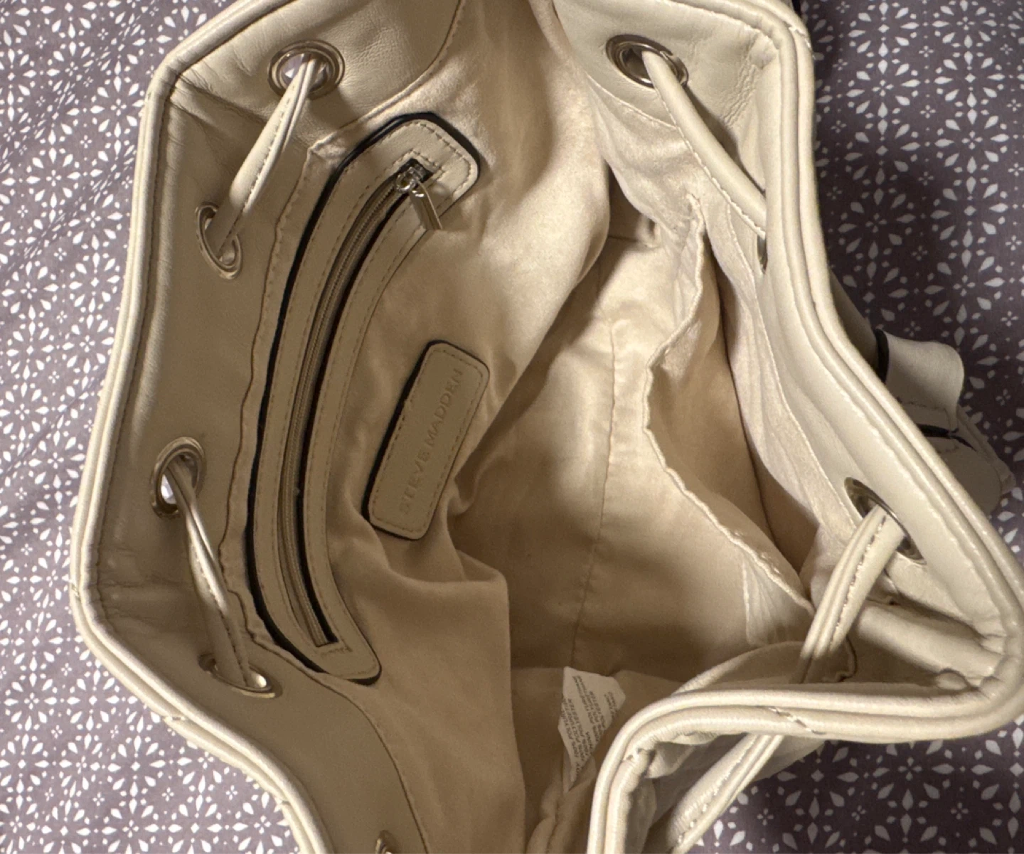 Selling a cute Steve Madden bucket bag! It's a tan/cream colour with a drawstring closure. The bag has a quilted design and is in great condition. Perfect for everyday use! Never used.