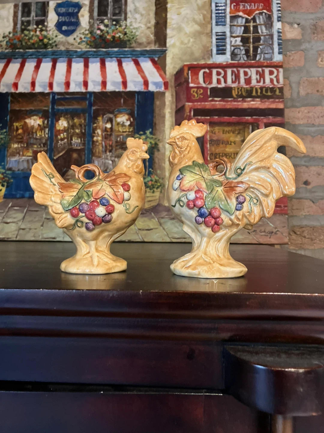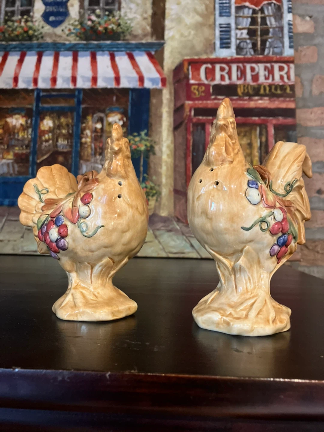 Fitz and Floyd Classics rooster and chicken salt and pepper shakers with grape design. Also make great kitchen decorations! They are new and ready to add some charm to your kitchen or dining table! Cash only and pickup ! Check out my other listings too!