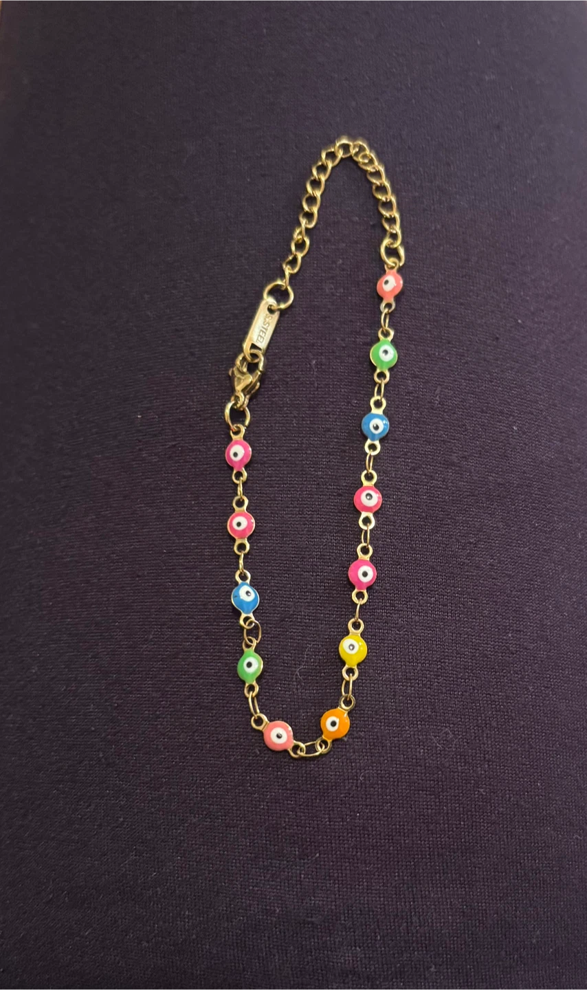 Cute evil eye bracelet! It has a gold chain and colourful evil eye beads. Perfect for adding a pop of colour to any outfit
