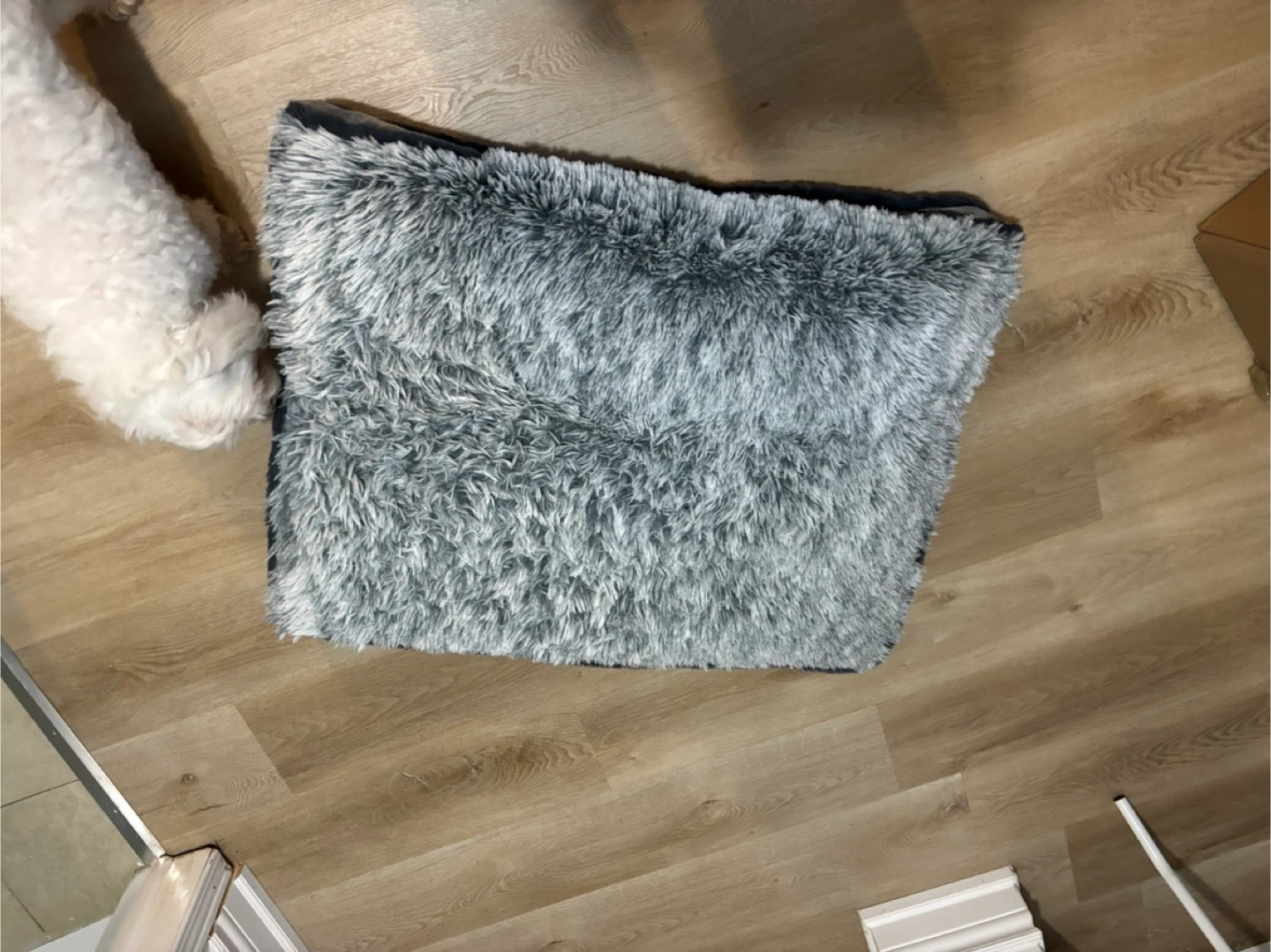 Selling a gray fluffy pet bed. It's in great condition and ready for a new furry friend to enjoy! The bed has a soft, plush top and a non-slip bottom for added stability