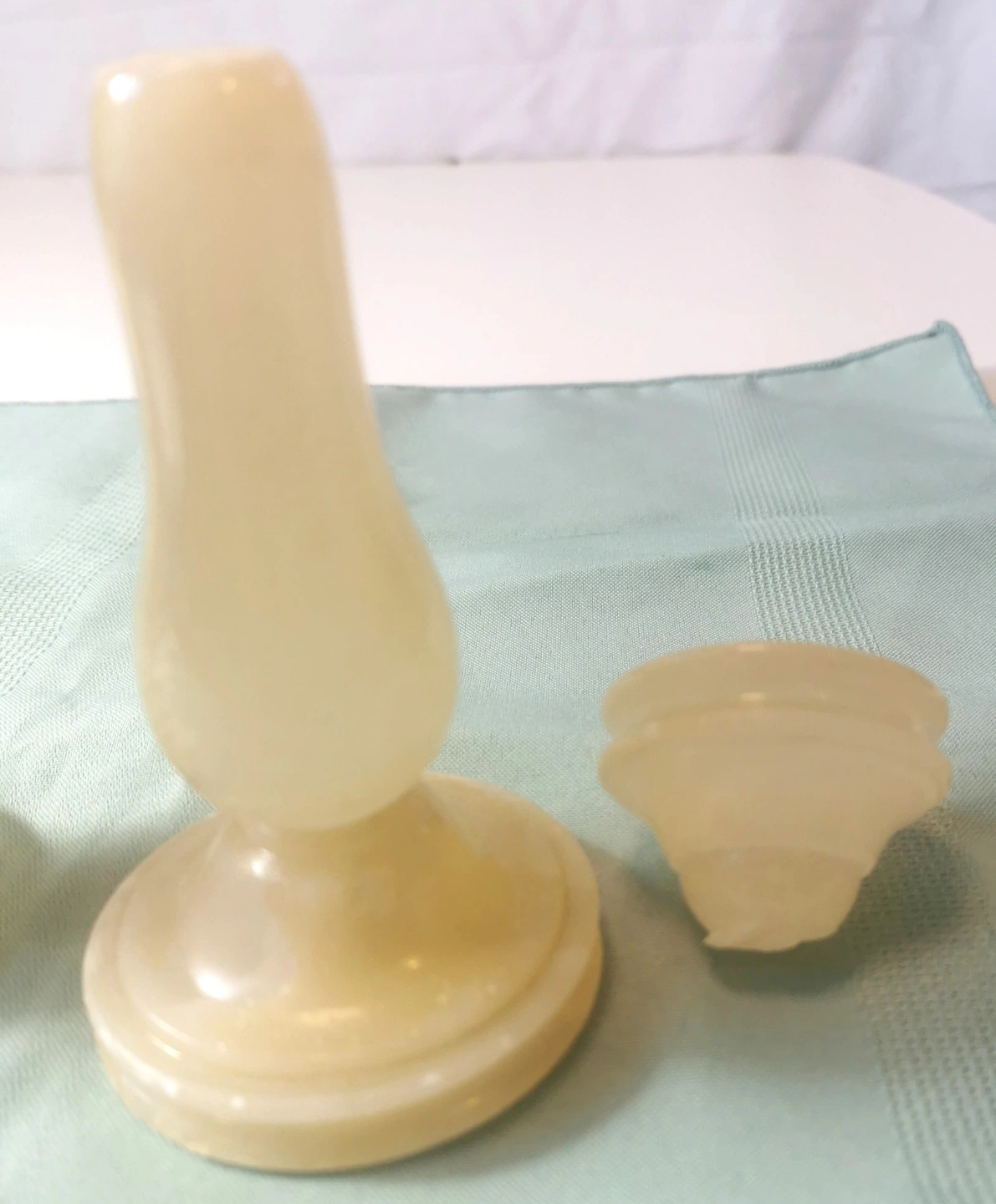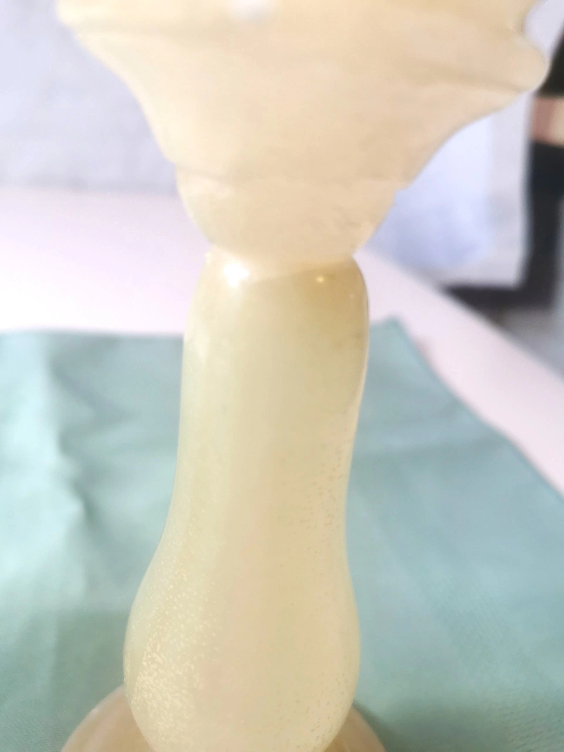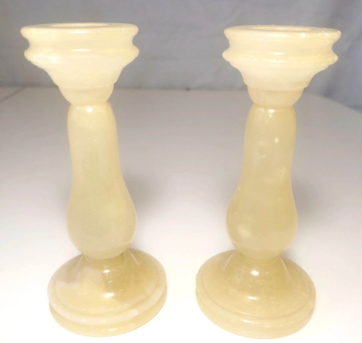 Pair of vintage Alibaster candle holders made in Italy. The candle holders are medium in size and feature a milk yellow color, fitting an all occasions style with an Italian aesthetic. The set includes two candle holders made from Alabastar material, adding a touch of elegance to any space with their unique design and charm. Dimensions: Height 5.75 inches, Diameter at widest point base 2.6 inches. Vintage item in good condition NOTE: one candle stick holder is broken please reference last three photos