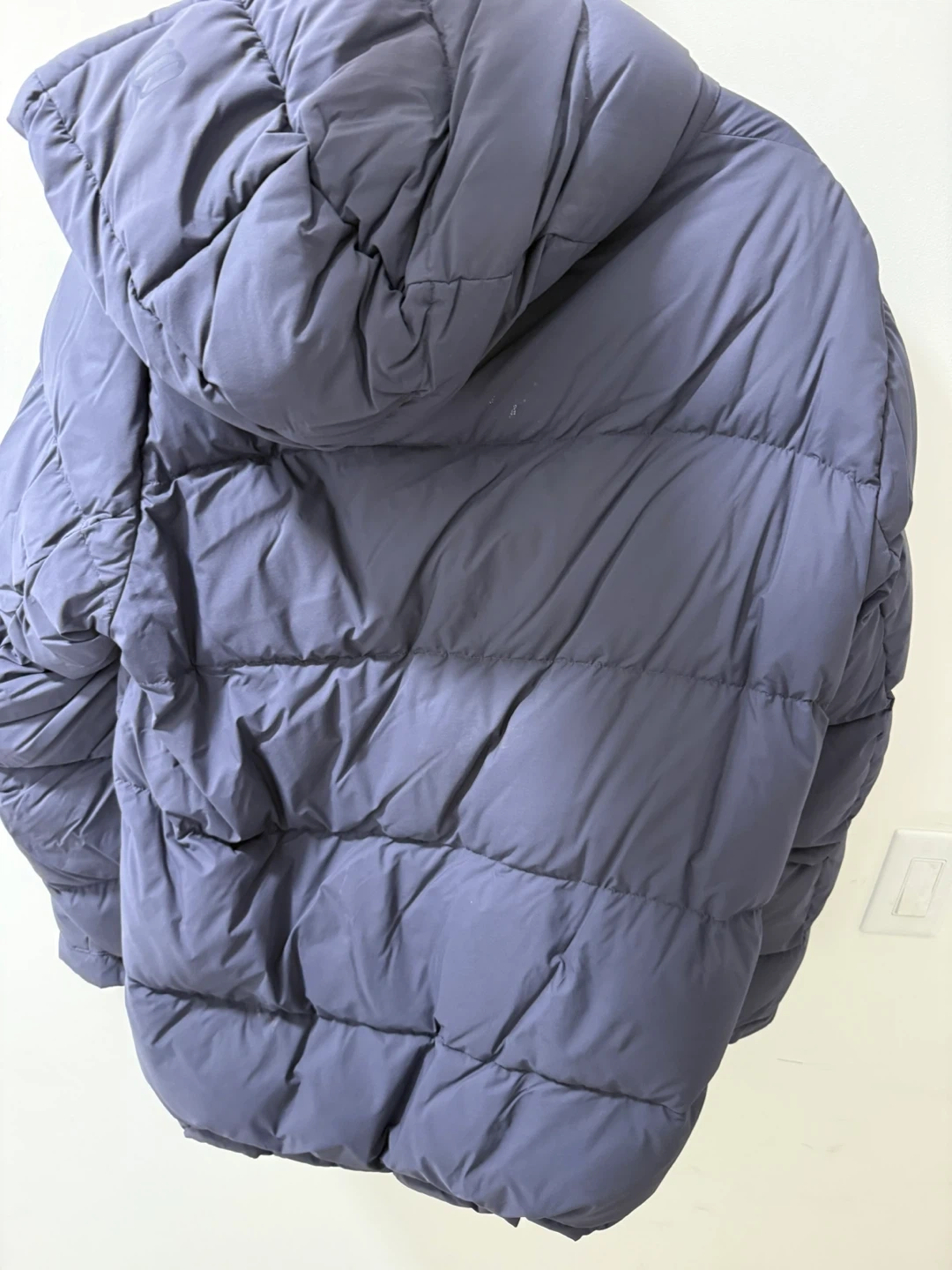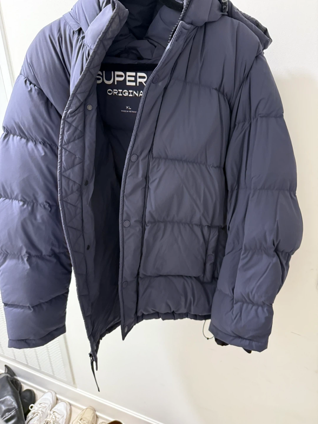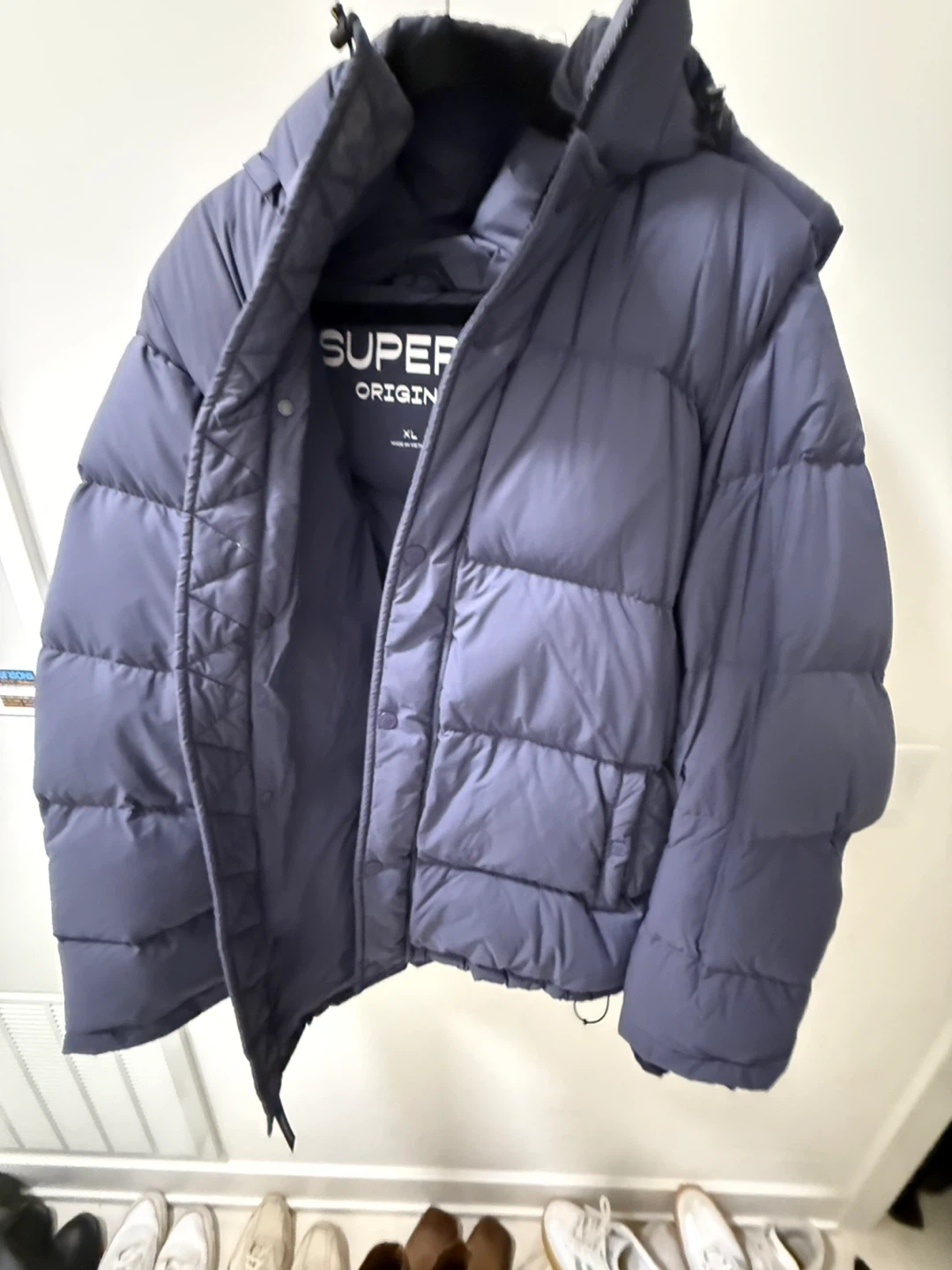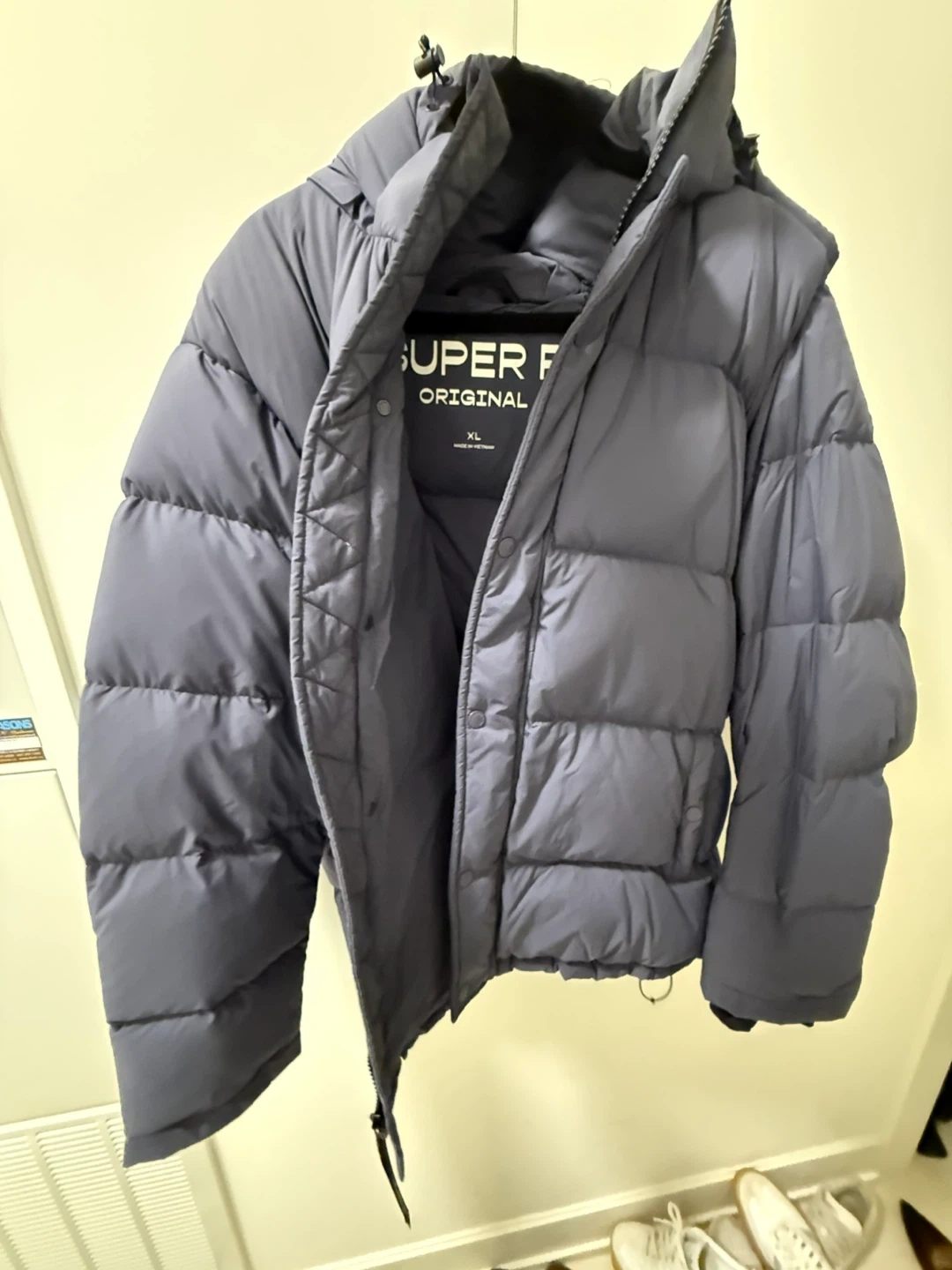Superpuff jacket in size XL. Great for the cold weather! It's in good condition. First photo shows the colour most accurately, middle photos show the quality, last photo shows the length most accurately. Colour: Brume (May be discontinued)
